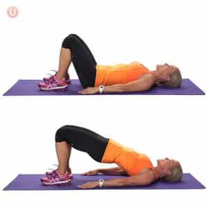 First, Lie on the floor with your knees bent and your feet firmly planted. Keep your lower back flush against the ground. Then, press your heels into the ground and squeeze your glutes while lifting your hips and lower back off the floor. Continue to contract your glutes and hamstrings until you reach your end range of motion, extending hips as high as you can. Hold for 3 to 5 seconds. Lower slowly with control, reset, and repeat. Start with 3 sets of 12-15 reps and work your way up to 25-30..