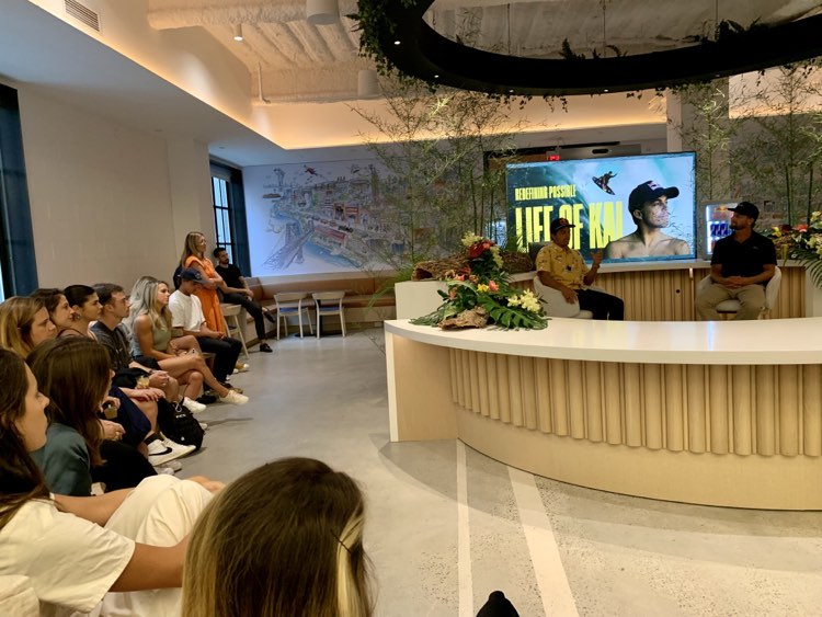 When it was time for Kai’s talk, we were hustled into a small amphitheater setting with the two surfers sitting casually up on the dias. Microphones were used but probably not needed as they were easily within range of a normal speaking volume and the crowd was intimate. The conversation flowed from the outset when Will asked Kai about his first wave (which Kai remembers at age 4). Kai said he knew from that moment that he wanted to be a professional surfer and went after it from there. Kai also spoke about his development of a progressive style in big waves by reminding the audience that the legendary break of Paia a.k.a. Jaws is literally in his backyard, so for him to experiment and attempt new tricks was relatively easy. He had a giant beast of a wave that he became most familiar with all the while surrounded by great talent and a supportive lineup. His ability to take risks is compounded by his long hours at the gym, preparation and careful calculation. This moment begs the question: Is it dedication or destiny that brought this amazing athlete to the pinnacle of his abilities?