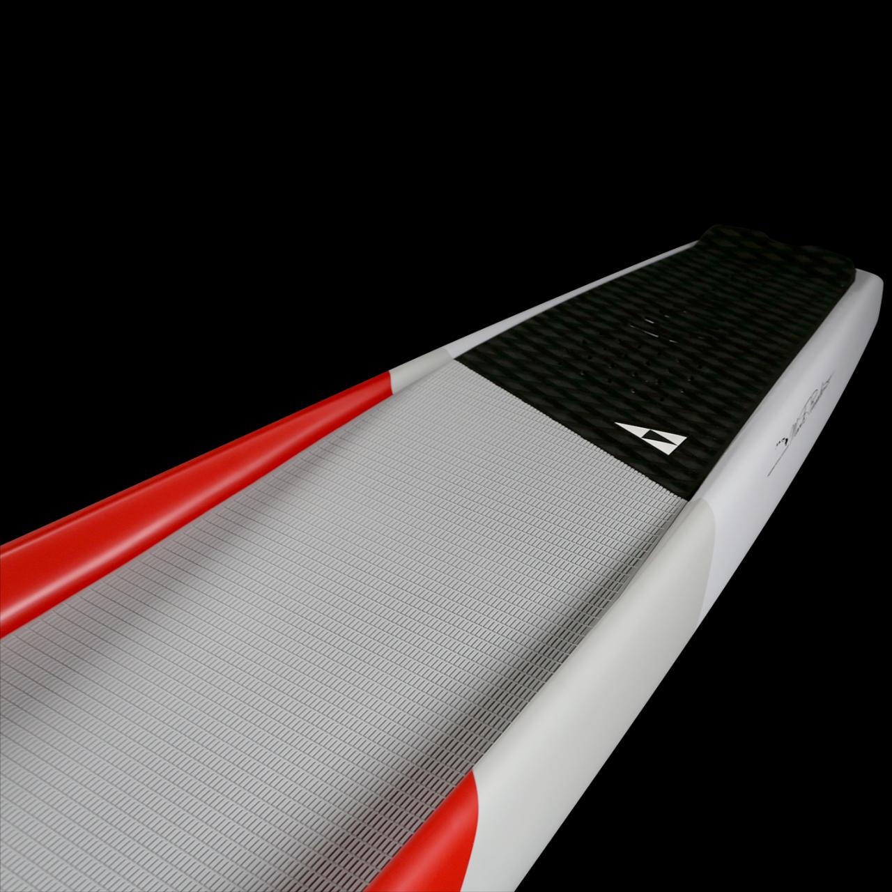 The RST offers speed and enhanced agility to paddle through rough water and swell using a narrowed outline, rounded rails, and a narrow tail. The dugout cockpit includes a lowered, flatted, and broadened standing area to provide stability for navigating challenging conditions. The RST’s increased bow volume and raised spine enable efficient navigation through choppy waters, while the signature venturi drain ensures rapid water evacuation from the deck of this stand up paddle racing board. A narrow outline with an extended bow on the bottom nose also reduces drag in flat conditions.