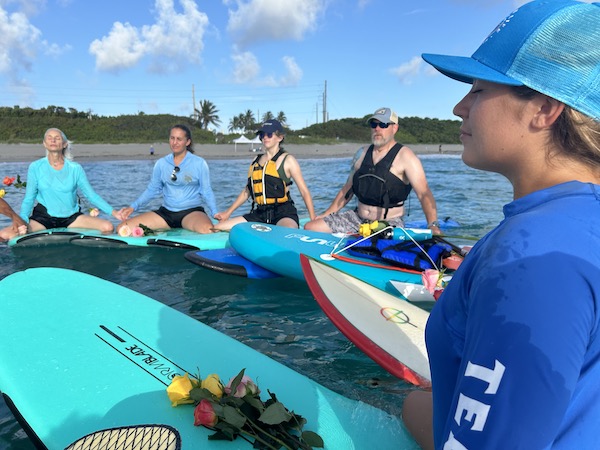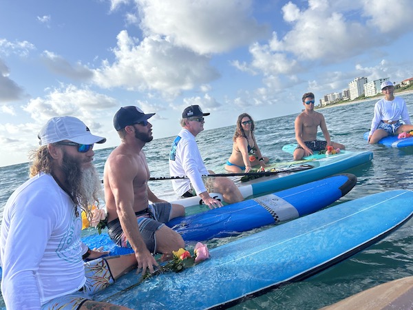 The personal and genuine stories shared about J were tremendous and testament to the Blue Mind Movement. Everyone at the paddle out loved the ocean. Everyone was associated with a nonprofit that somehow - whether by a direct or slightly longer route - tied to the water. Hearing everyone speak, some whom had never met J, but were nonetheless touched by him and his “wave” were inspiring. There was Allison Fielding who started the nonprofit Stoked on Life Palm Beach and another volunteer from the same group, David Fielding, who became our director on the water for the Paddle Out. They welcome those with mental and addiction disorders to the calming and healing effects of the ocean. They mentor and profess “Mindfulness Based Ocean and Surf Therapy”.