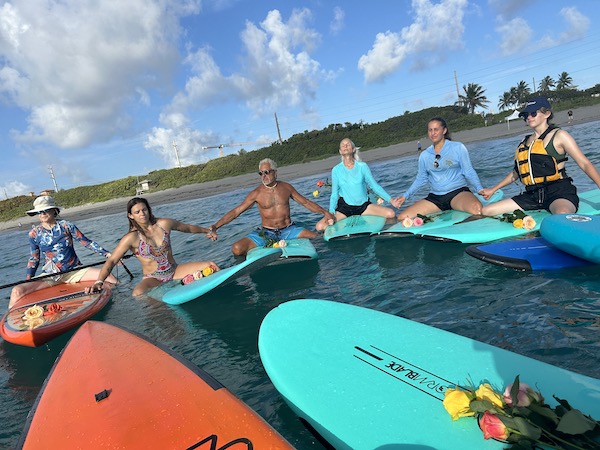 As Hudson playfully jumped into the ocean with a robust SPLASH, I was reminded that the Paddle Out for Wallace J. Nichols was in a couple of hours, just a couple of miles down the road in Juno Beach on the sand adjacent to the LMC. J Nichols passed away unexpectedly in June and was the founder of the Blue Mind Movement, largely through his studies as stated in his best-selling book, Blue Mind. J professed, and everyone I know agreed, with the fact that “being near, in, on, or under water can make you happier, healthier, more connected, and better at what you do.”