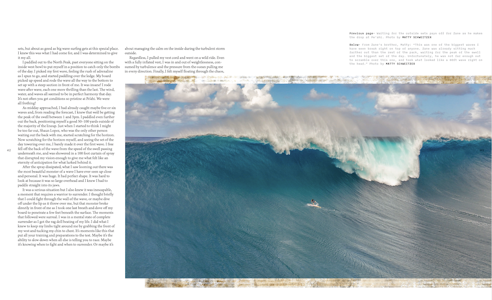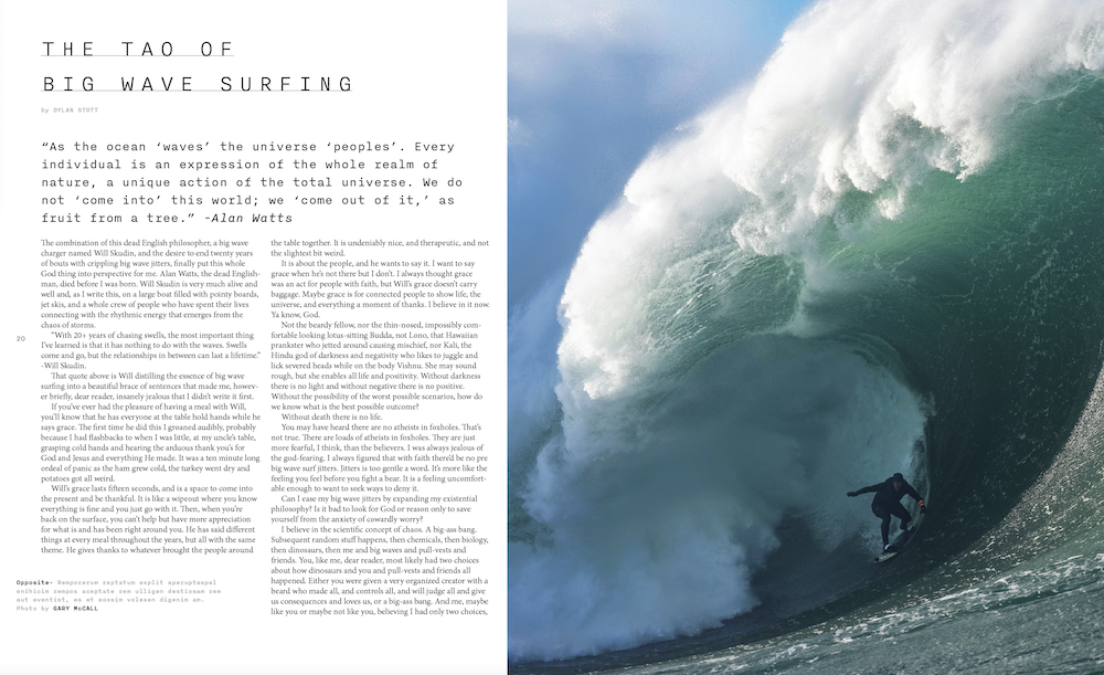 We gave a lot of thought to how this first issue would roll out. But nature ran its course and we slipped into the flow, letting the pulse of timely events build the narrative that would explain how things went down. Giant swells filled the timeline, one behind the other. No one could argue that we were witnessing one of the most prolific demonstrations of natural power known to humankind. Thus, this inaugural issue will have a slight bent toward the biggest stage of all – the big wave stage. Nothing captures our attention more than the images of what could be the biggest waves ever ridden. Very few natural events can compare to the awe and the grace of a giant wave, followed by another giant wave, in a destination thousands of miles away connected to the same source of energy.