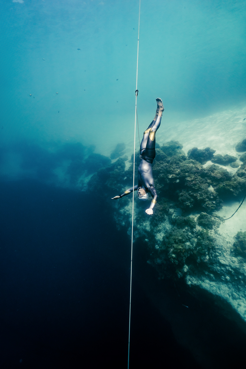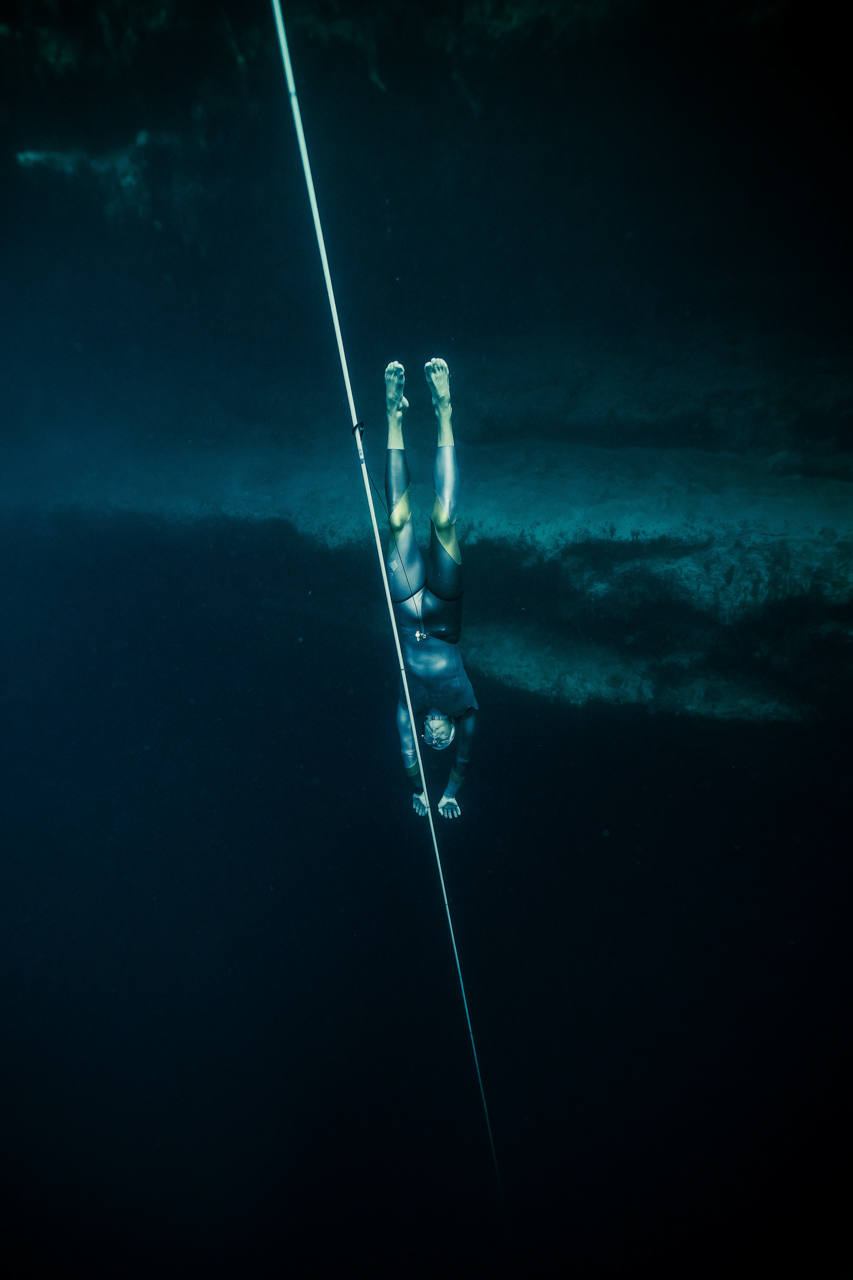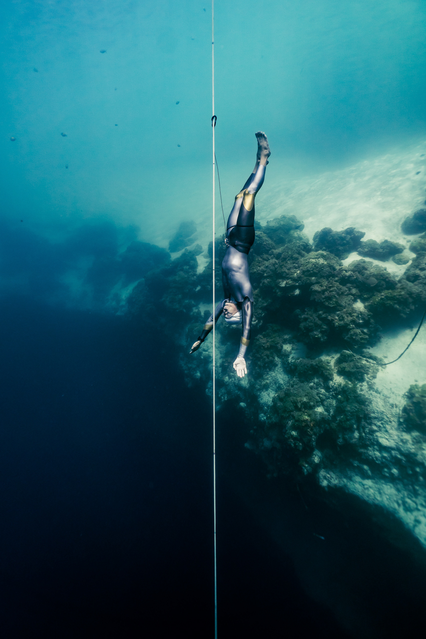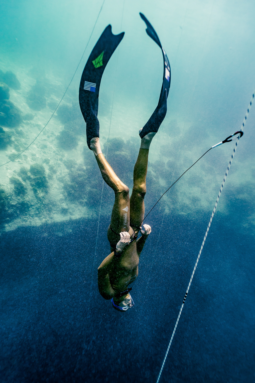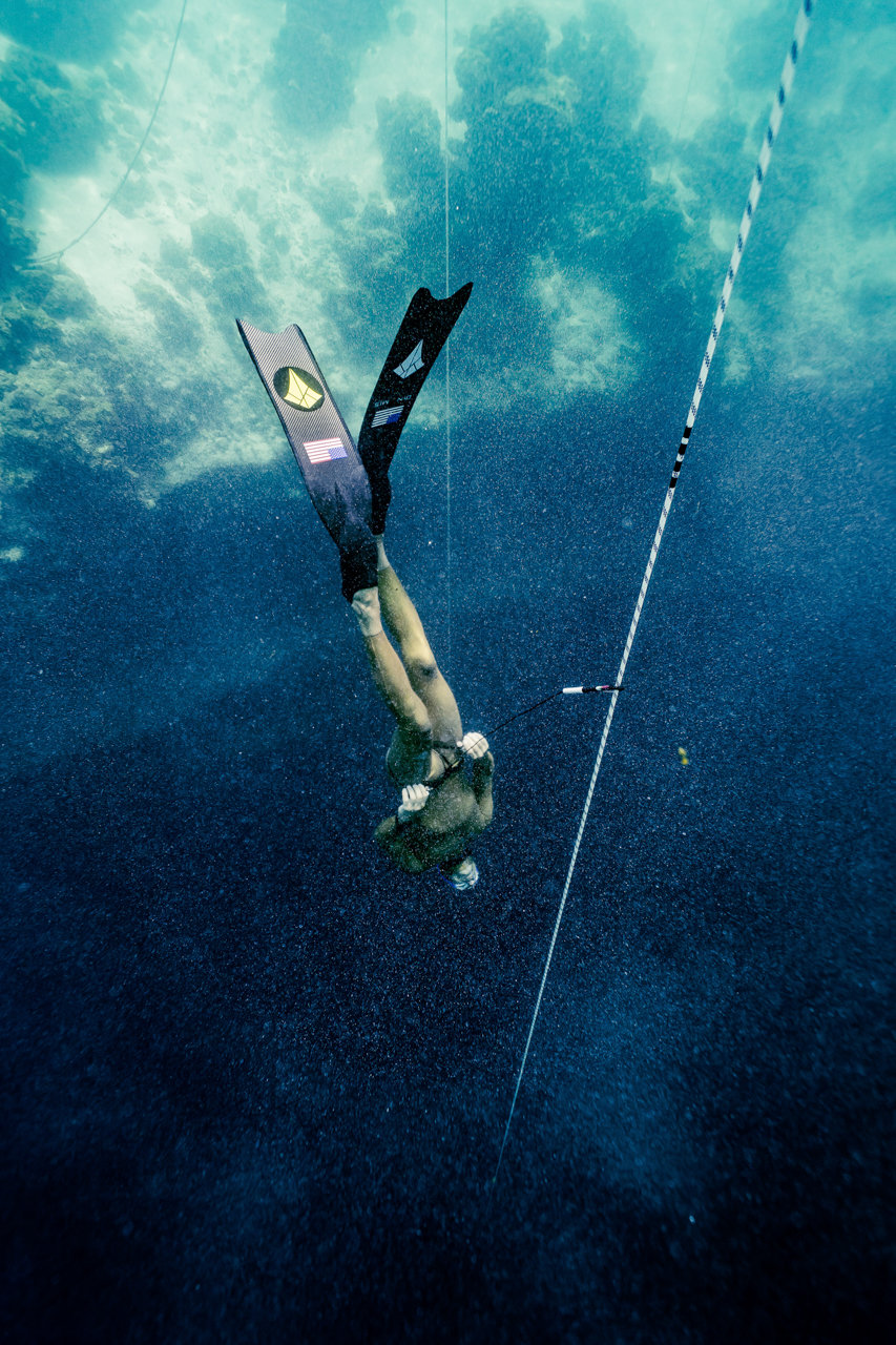 Alex is a national and continental record holding freediver from Colombia. No sport on earth pushes the limits of breath hold more than freediving. In fact, freediving is so dangerous, it claims more lives than any other sport each year. The term freediving comes from the Greek word apnea which means “without air.” The sport is elegant in its simplicity - no tank, no snorkel, and in some cases, no fins. The goal is to hold your breath as long as you can while you descend to a depth or swim laps in a pool on a single breath. Divers compete using little to no equipment. The use of fins (or no fins) and the type of fins define the different classes of competition. Bi-fins are what we mostly commonly think of when we think of divers. These are long carbon fiber "blades" worn on each foot. Monofins are a single dolphin-tail-shaped fin where both feet and legs work together in a porpoise-like kicking motion to move the diver through the water. The best free divers in the world follow a competition circuit that takes them around the globe pushing one another to personal, national, continental, and world record setting bests. The locations for many of these events are held in beautiful geological phenomena like the one going on right now at Dean's Blue Hole on Long Island, Bahamas.