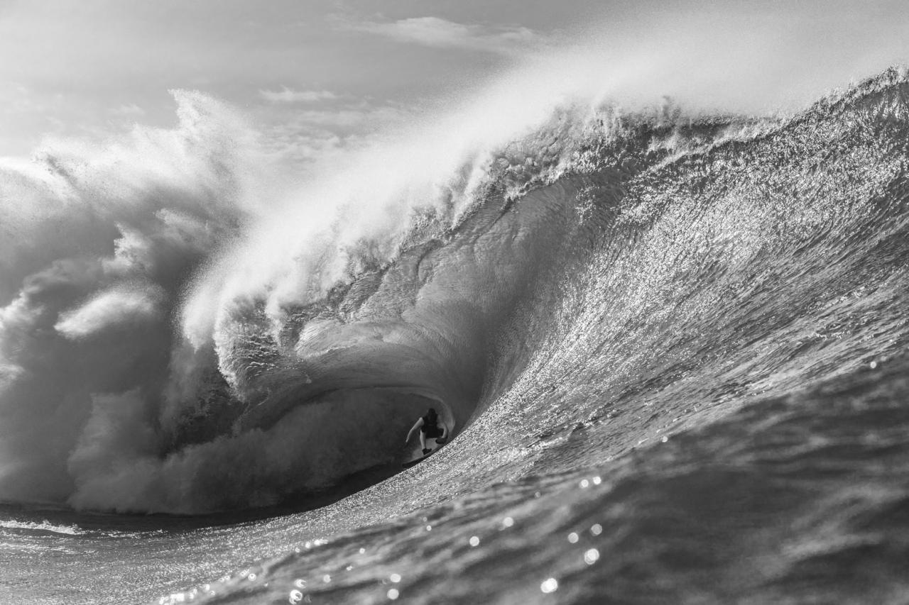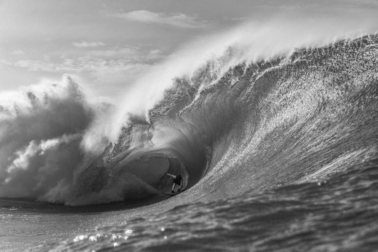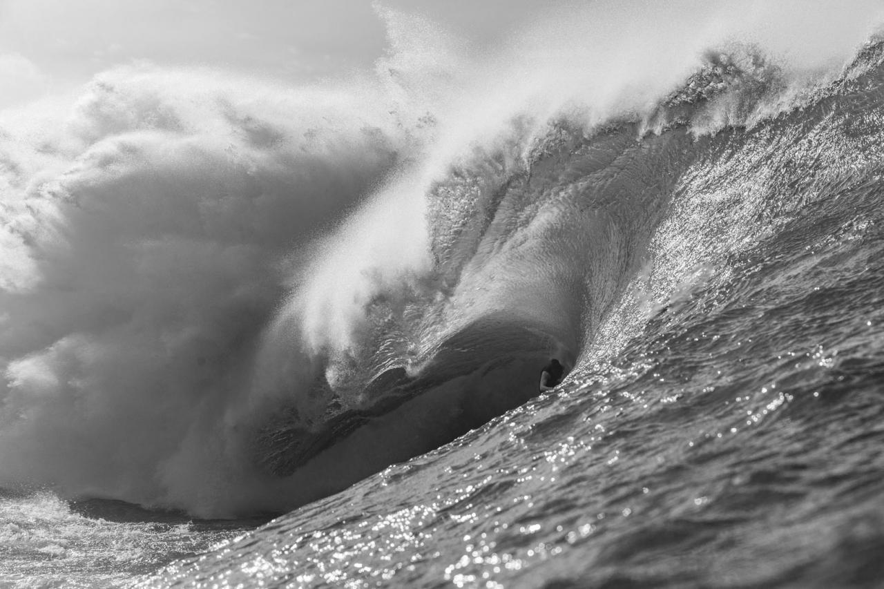 While imagining this conversation in my head, one final wave emerged from the dark sea. This wave came alone to the reef, about three minutes after the set, in a way waves don’t. You never see one more wave come in three minutes after the set. This one came in unusually, at an angle different to the rest, and when it hit the reef there was only one person in position to catch it. Mason didn’t hesitate. He sat under it, paddled, head down, into a very scary and technical drop, turned at the bottom, and rode into the barrel of the best wave of the day, the best of the year. That rare angle made the wave grow even bigger as it exploded down the reef.