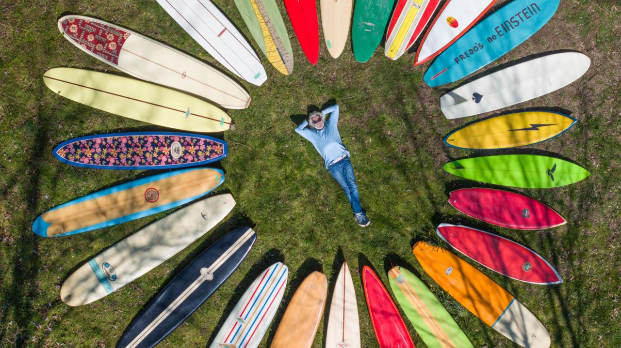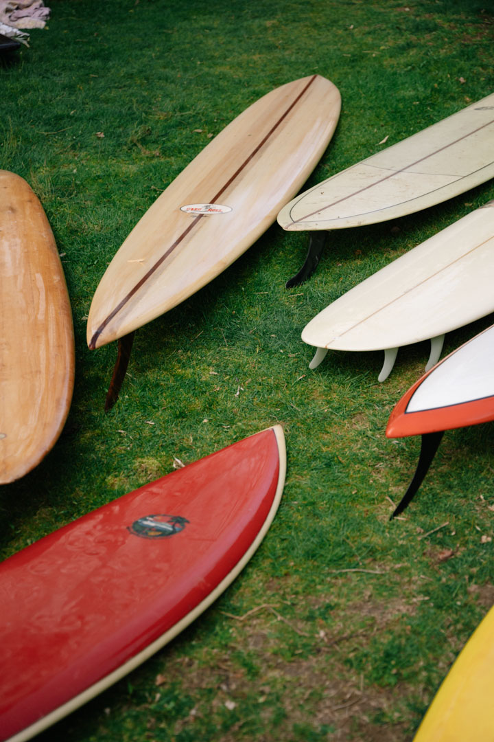 “Now, these are really special,” he says. “These are the ‘Endless Summer’ boards from the 1966 film. The Smithsonian was having a luau to celebrate surfing’s official integration into American culture. I was there with everyone you can imagine for the event and they actually had a board auction. These are the exact replicas of the boards that Mike Henson and Robert August rode in ‘Endless Summer’. Mike and Robert were at the Luau and the boards were signed by them. I had to get them.”