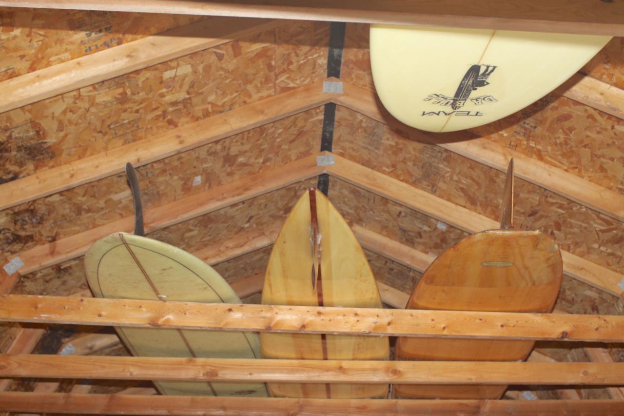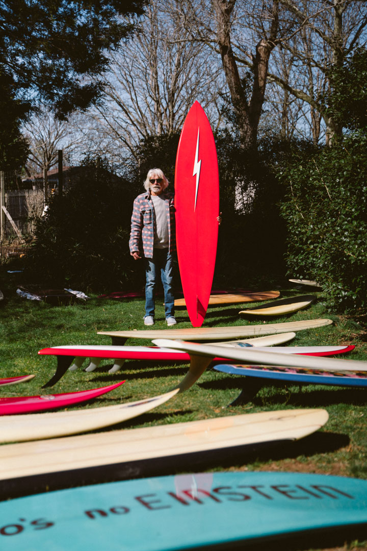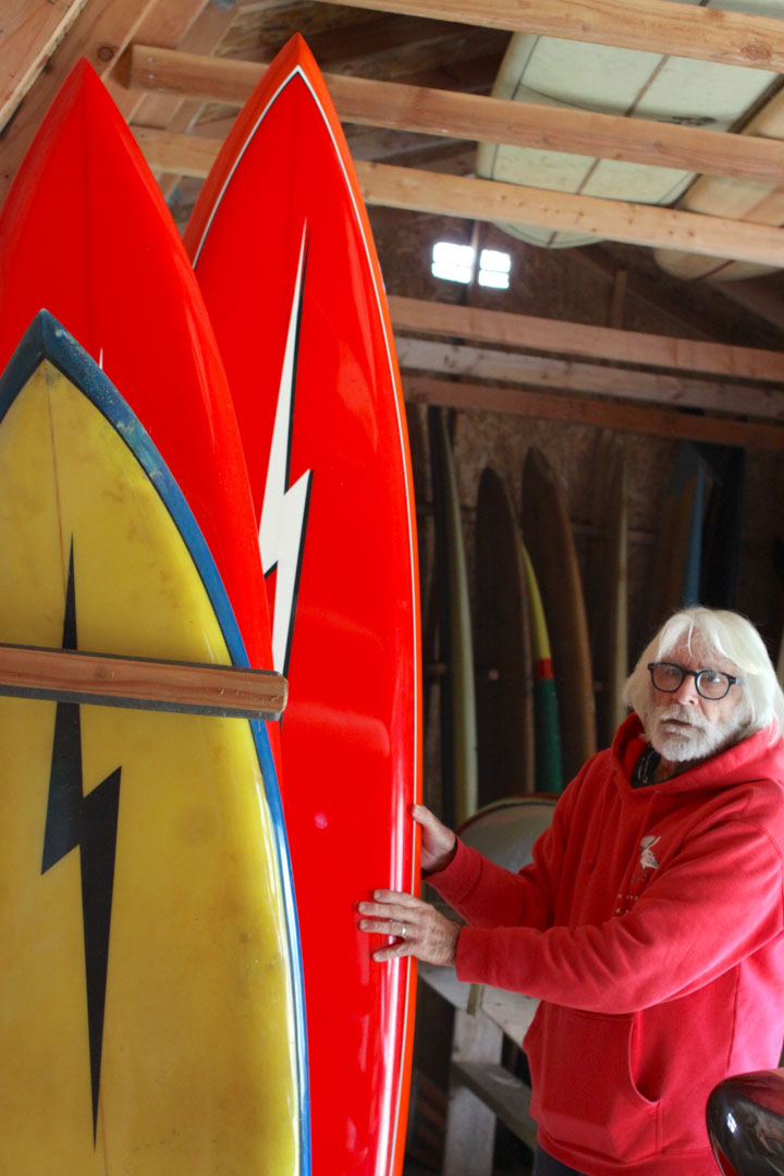 He looks up and points towards the boards hanging overhead, “Then up here in the rafters, we have three special shapes: this is the board that Donald Takayama made Joel [Tudor] for his 21st birthday. Joel actually got it here and has left it with me ever since. It’s still his board but,” he adds with a laugh, “its been here for like 25 years.”