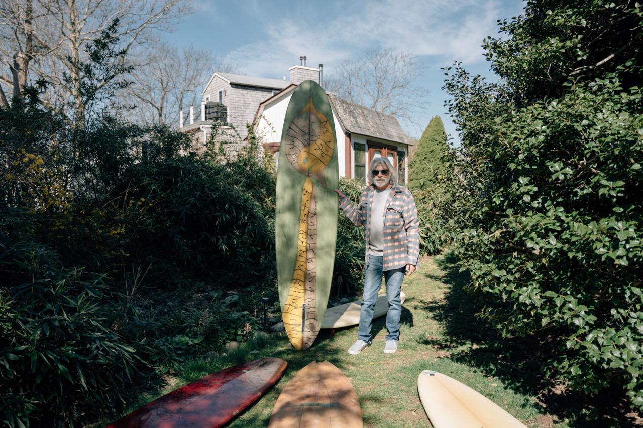 He continues down the line, ticking off boards and moments in surf history. “Bunger Flower Deck,” Bunger is the original surf shop in NY from the ‘60s. It continues to be family-owned and operated in the heart of Long Island and is still a staple in New York surf culture. That flower deck board holds a bookmark in time.