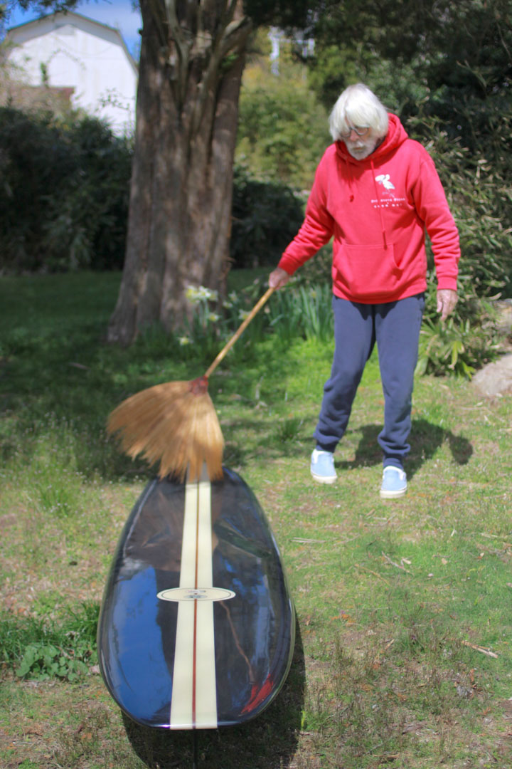 TC turns his head and looks up at a board in a horizontal rack. The energy ticked back up. “This is a replica of the original shortboard: The Fantastic Plastic that Bob McTavish brought to Hawaii when he famously failed at Sunset before blowing everyone’s mind at Honolua Bay. This is replica #7 that Bob made when boards started dropping in size every month and the V-shaped bottoms began to take over. See the Black Spade on the bottom? That was McTavish’s original logo.”