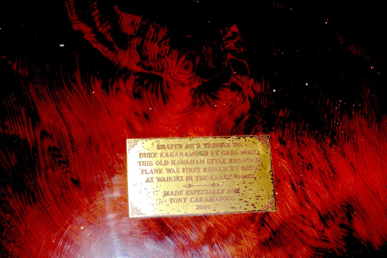 Next, he looks down at the floor where there lies a gigantic, polished piece of redwood. It is shaped from a definitive era and there is a commemorative plaque affixed to the deck. It’s easy to see that this is something special. “This is a replica of the Original Duke boards from the beginning of the 20th century,” says TC. “It’s solid redwood and you see that bronze plaque in the center of it commemorating it as a rare piece of surf history. [The plaque reads: ‘Crafted as a Tribute to Duke Kahanamoku by Greg Noll’ This Old Hawaiian Style Redwood Plank was first Ridden by The Duke at Waikiki in the early 20th Century. Made Especially for Tony Caramonico 2004’]. That one is extremely special,” explains TC. “It’s also so damn heavy, that’s why it's lying horizontal. I need to rearrange things to find the right spot for it. It’s like 60 pounds or something.” The polished redwood shimmered as I looked at it. It is the replica from when Duke was the ambassador of surfing to the whole world, competing in the Olympics in swimming and spreading Hawaiian culture, the spirit of aloha and the art of wave riding to the rest of the world. I was looking at the seed of all modern surf culture.