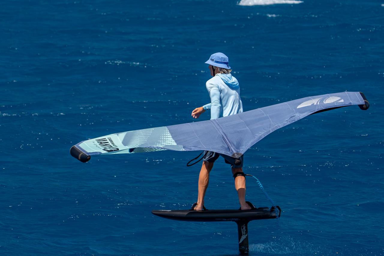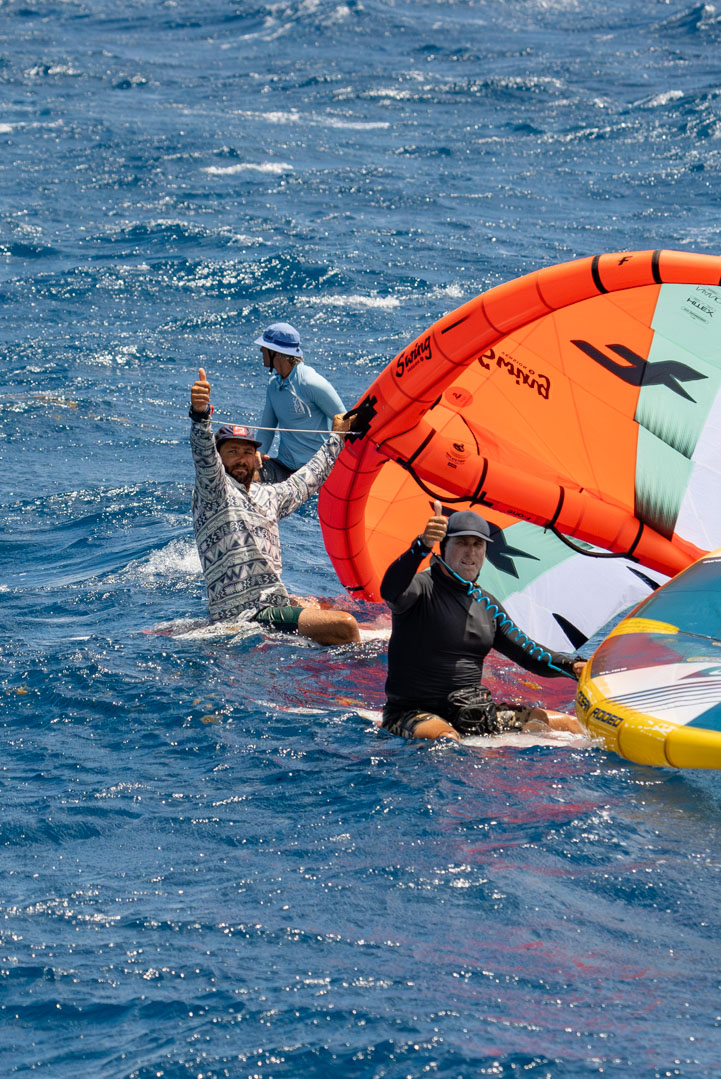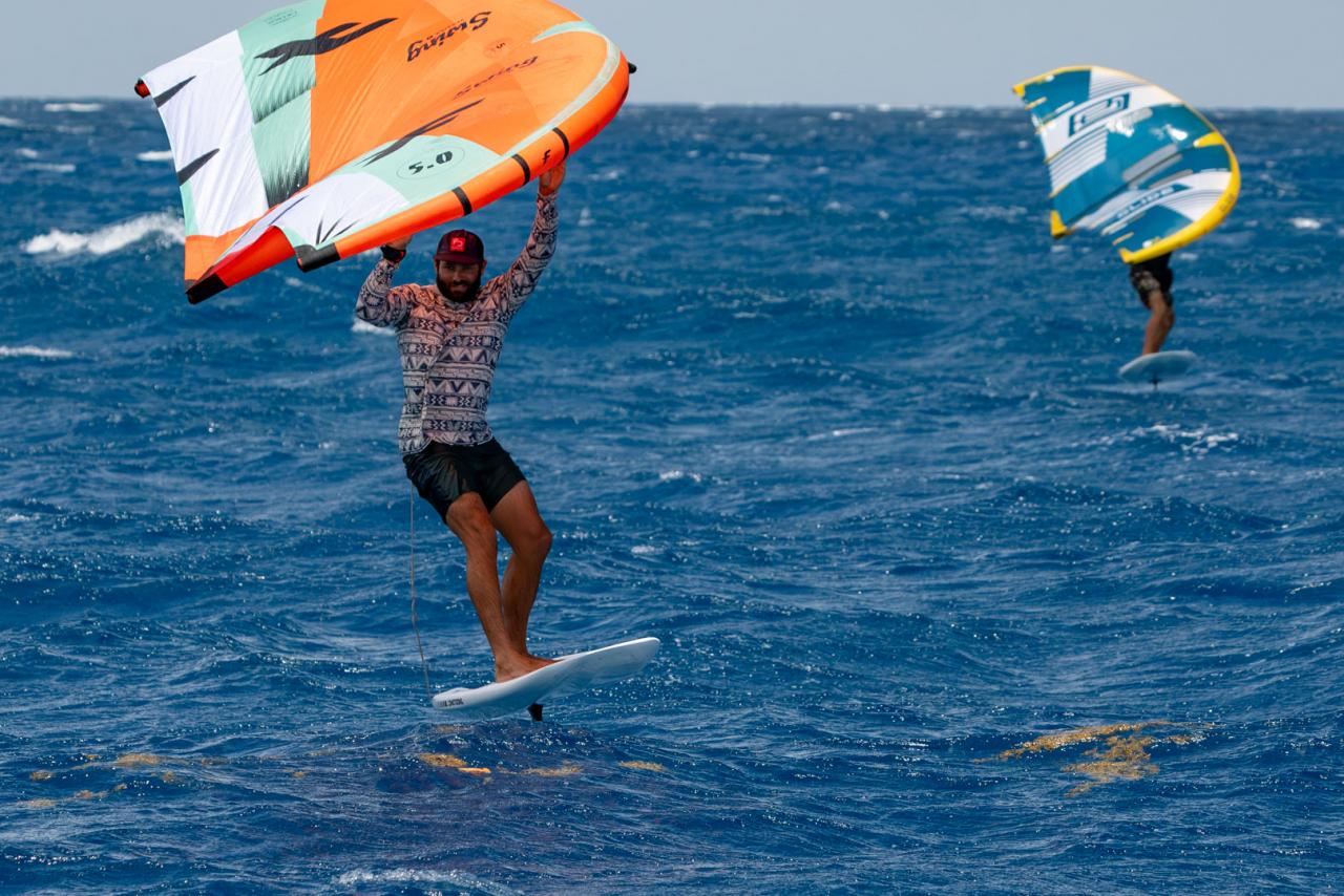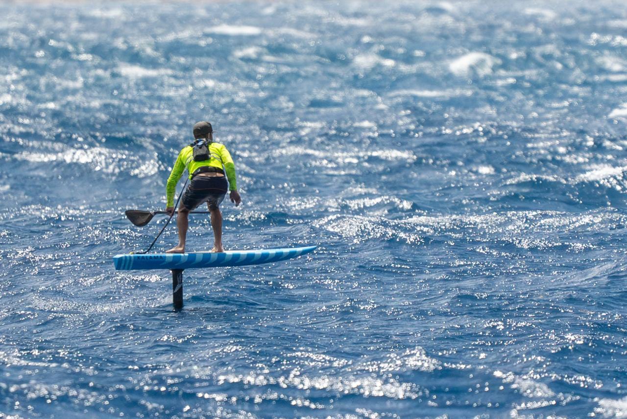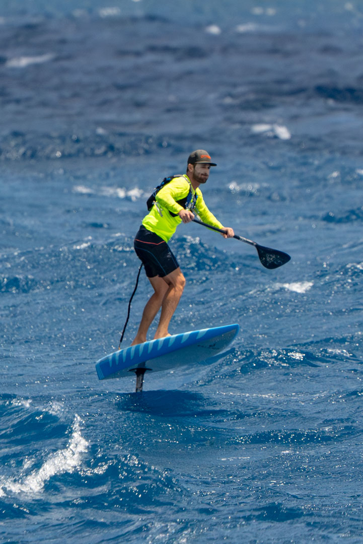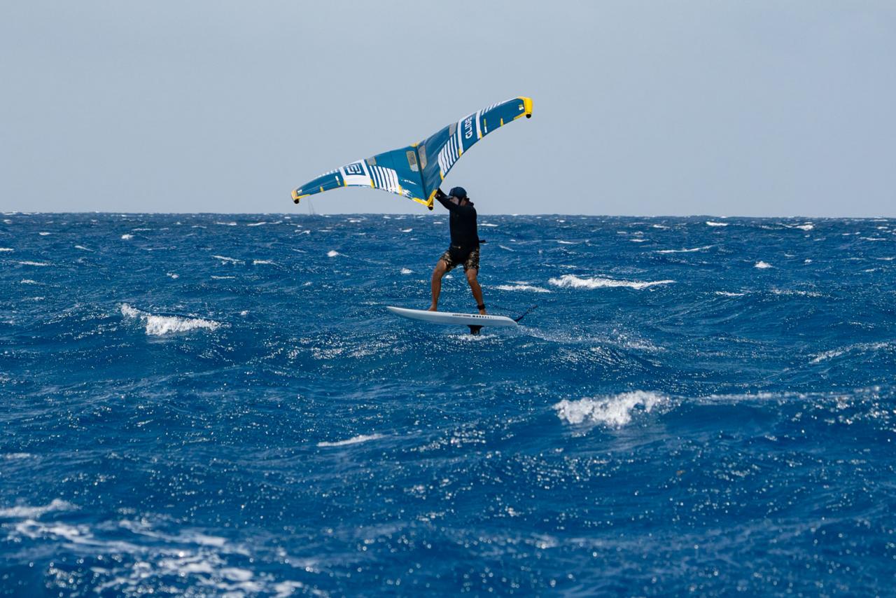 The sky slowly started opening to reveal growing areas of blue. The wait was almost over and it was time to make our final preparations. Carson called us to the back deck to go over our safety plan, then he took us through a prayer. The four of us stood in a circle with hands clasped as Carson asked the “powers that be” to watch over us in our frivolous pursuit of pure enjoyment. Carson, Adrien and myself jumped into the water with our wings as Bobby slid off the deck and onto his downwind SUP. We all agreed that sticking together was the best plan — this was not going to be a race. As the remaining storm clouds dispersed, the wind picked up a few more knots and we were off the starting blocks and well on our way toward Jost.