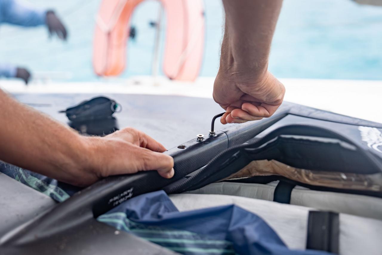 Once our boat was securely anchored, it was time to set up for the first wing session of the trip. The wind was on the lighter side, but the location was surreal. Excitement was riding high as we worked to figure out how to safely and efficiently assemble the foils and inflate the wings off the aft deck. Once we were in the water, the temptation to get upwind to Necker was too tempting. There was also a nice line of wind swell bumps between Necker and Eustatia further incentivizing us to head in that direction. We made our way upwind and surfed the wind swell for a couple hours, taking time out to set foot on the mysterious sand spit off Necker where Branson had planted a few fake palms. As the sun started to set and the wind began to fade, we made our way back to the boat completing the first of many cycles launching and landing from our floating command center.