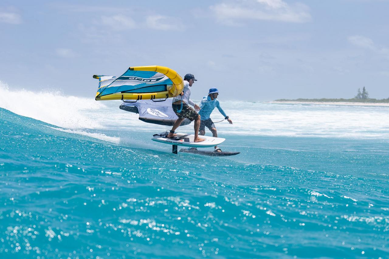 We pumped up the smallest wings we’d brought and launched off the back of the Y-Nissi. The water was emerald green with patches of shallow coral below and visible puffs of offshore textures on the surface. The wind direction was in our favor giving us a straight shot to the far end of the reef on a single tack. The direct exposure of Ruffling Point produces a wave with plenty of energy and raw North Atlantic power. The conditions lined up beautifully for foiling with a combination of open ocean swell on the outside and a perfect right-hander on the inside that broke into a nice, deep water channel. Levin had cautioned us before we left the boat letting us know that the closest hospital was back in Tortola so “take it easy”. Up until this point, he didn't know how much experience we'd had in conditions like these and quite honestly, neither did we.