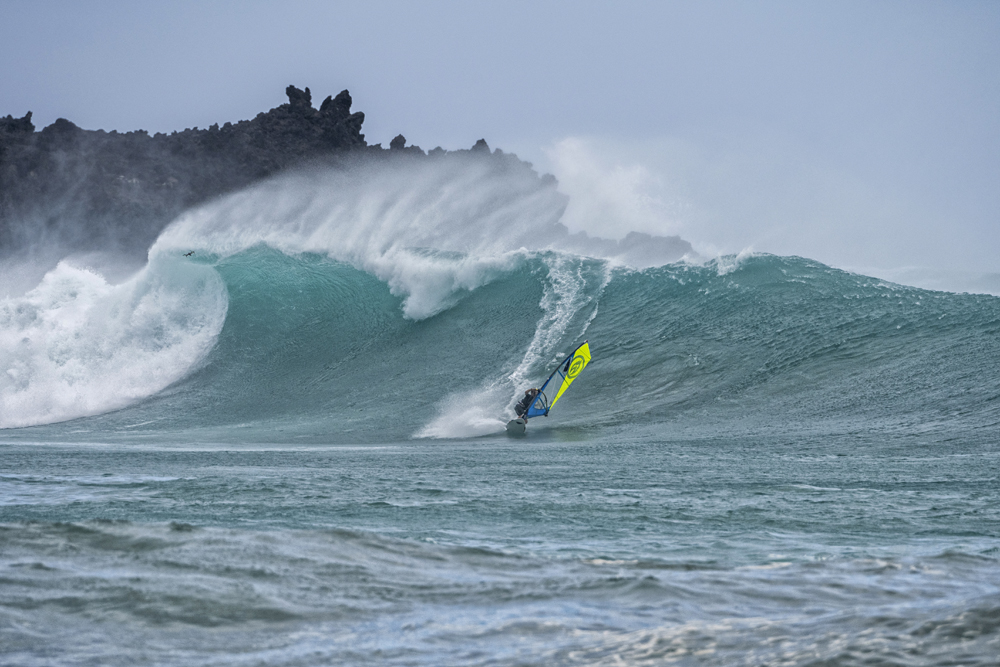 This swell was supposed to peak in the afternoon, and while we were out there we experienced some big pulses of sets. I took off on the second wave in a set. I had an easy takeoff and set up a few turns before the inside section started to build up. When it did, I felt like I should eject the sail and just pull into the barrel because I lost power in the wind and was racing down the line trying to keep my board speed up to get around the heavy, double mast, high section, but I just couldn’t get around it. With a last chance to control myself before surrendering to a pounding, I straightened out and waited for the right moment to eject as the coastline inside that section is unforgiving, to say the least, with jagged slabs of lava rock.