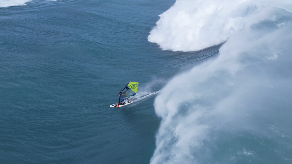 I rigged up my smallest sail which was a Hot Sails Maui 3.7, along with my Jaws windsurf board shaped by Sean Ordonez, and was stoked to join the boys out on the water. The conditions were challenging, no doubt about it, as the wind was filled with holes and far offshore, but once I got into position on the outside, we were powered up at full speed. It felt so good to drop into solid, big surf riding port tack wave riding as I am a natural goofy footer and most sessions on Maui are starboard tack wave riding. I stayed for a good hour and a half, having such an epic time trading off waves with two windsurf legends and heroes of mine. We were all awed by the size and energy we were experiencing. A few waves peaked at 12-15’ Hawaiian, which is well over 30’ faces!