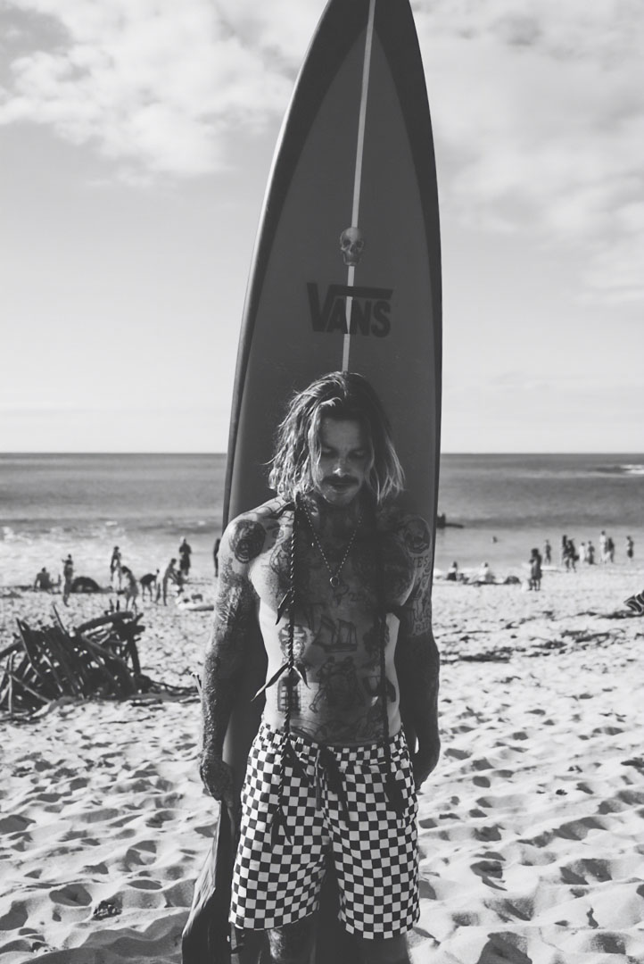I kinda want the waves he gets at Mully, too, but know I’ll never get them. I only want them from a distance in both space and time. Being honest with my actions in the present moment, I know how I feel when those big set waves stand up in front of me. I know what I will do. I’ll paddle out to safety, just like I’ll run like hell from a tattoo needle, run faster from a shark tooth, hammer, and pot of ink. Some of Lowey’s tattoos were done in New Zealand, in that traditional way, and are representative of family ancestors. I want a Maori tattoo only when I’m not living in the present. Only some ideal self would want that.