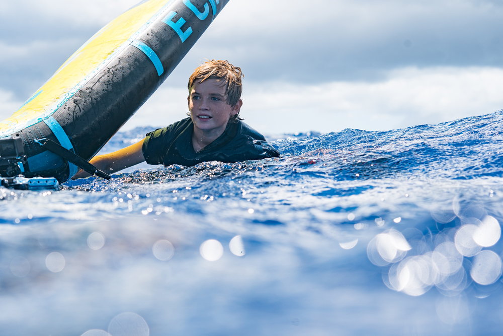 Bobo: Being a part of the water community in Maui means everything. When I arrive at the parking lot at Kanaha or Kite Beach, I get excited to see who is there and who I might be in the water with on that day. How great it is to see people you know and be totally inspired to be in the water with the best, most experienced watermen and water women in the world. So many friends and adults have helped with my training, like Josh Riccio and Ken Winner. They made it possible for me to complete the crossing. I need adults with me for safety in the open ocean, and that has meant everything to me because it empowered me to do things I couldn’t have done or even trained for by myself, like crossing the Alenuihaha on a wing or to solo SUP foil the Pailolo channel (Maui2Molokai) last year at age 10, or tandem the event at age 9 with Lara Claydon.