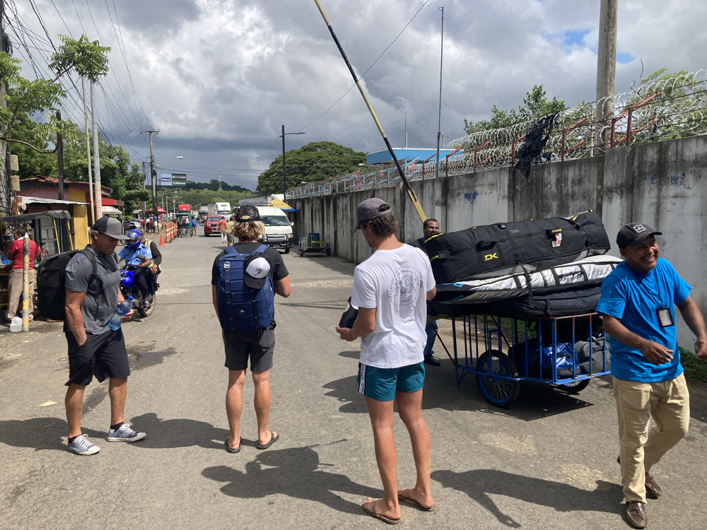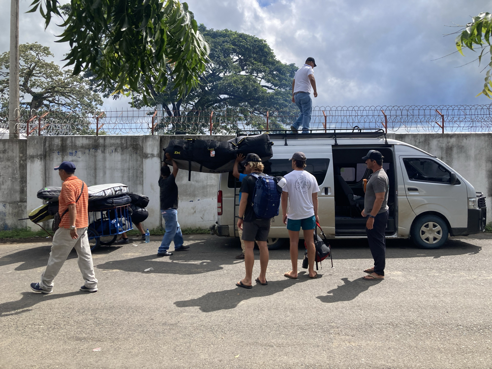 The first flight in our itinerary was the last time anything felt routine or matter-of-fact. After touching down in Central America and finding our way through baggage claim and customs, we were instantly met with a marketplace of taxi services and transportation offers that felt as intense as the floor of the New York stock exchange during a rally. Through the crowd we spotted our guy who muttered the words Foil X then displayed a sign with our last names scribbled in dry erase marker. The four of us were ushered to a generously-sized van with ample roof rack space. We scaled the ladder on the back door of the autobus and immediately began the process of stacking board bags and lashing everything down. The humidity was hitting us hard and it was at that moment that I was grateful for the extra t-shirt I had stashed in my backpack before boarding the bus for the long drive to the border.