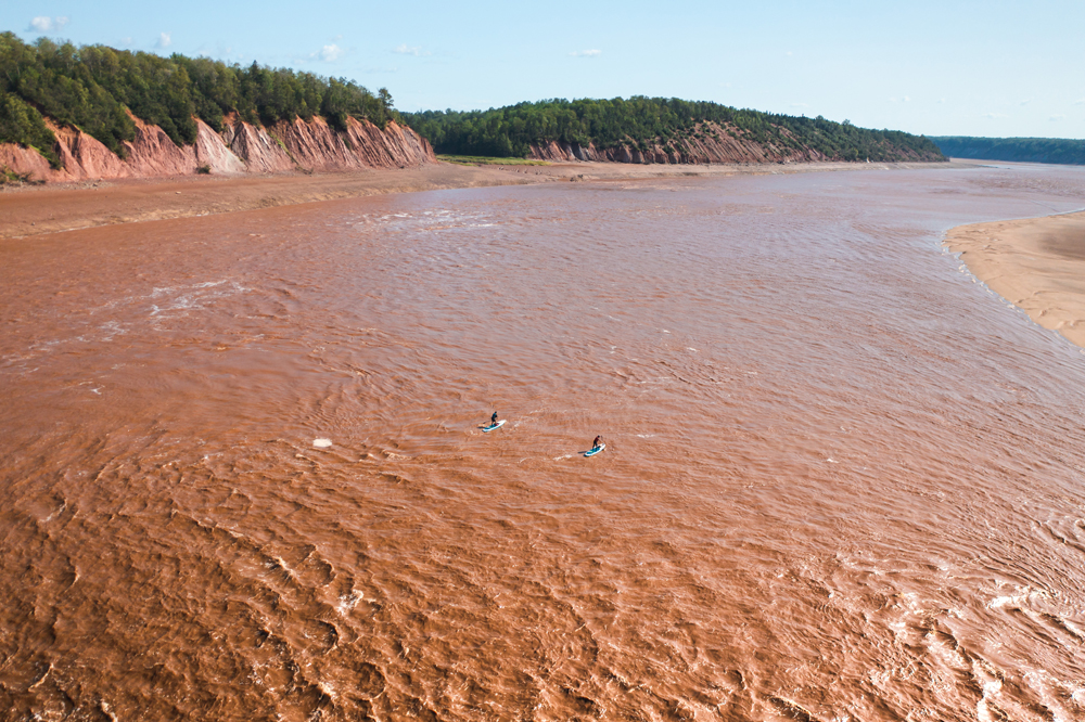 Five weeks into the expedition, after 23 days of paddling and with great humility, I completed the Atlantic coast leg of Nova Scotia. The next section was the mighty Northumberland Strait. Tucked in the shelter of Prince Edward Island, the calm waters of the Strait provided gentle paddling and time for reflection. After long days on my own on the water, my friend Dan joined me. The warmth of companionship, late-night driftwood fires on the red sand beaches, vulnerable conversations, and impromptu afternoon clam-digging overshadowed the constant desire I had to keep moving. I began to develop a deeper intuitive relationship with the environment that surrounded us. The clouds told stories about the trajectory of the day’s wind patterns, and the winds whispered warnings of impending changes in the sea state. When the Northumberland Strait came to an end, I hopped a car shuttle to the top of the Shubenacadie River where I prepared to enter one of the most intimidating sections of the route. Well-known for having some of the highest tidal fluctuations in the world, I was about to enter The Bay of Fundy. Playtime was over. This mighty crossing brought me back to business. It was time to finish my circumnavigation.