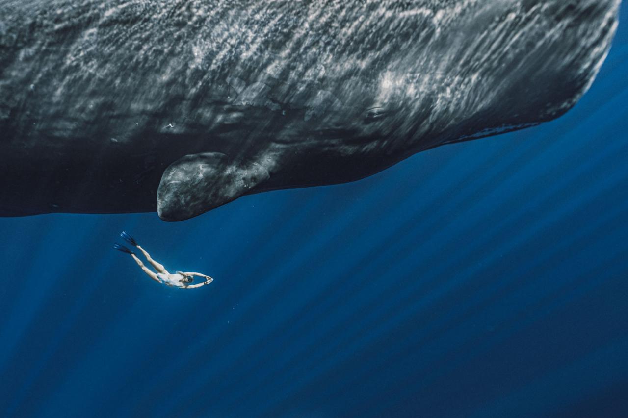 Waterwoman, champion windsurfer, and deep sea diver, Olya Raskina, floats alongside a fellow aquatic traveler in a rare moment of repose off the coast of Mauritius.Kirill Umrikhin