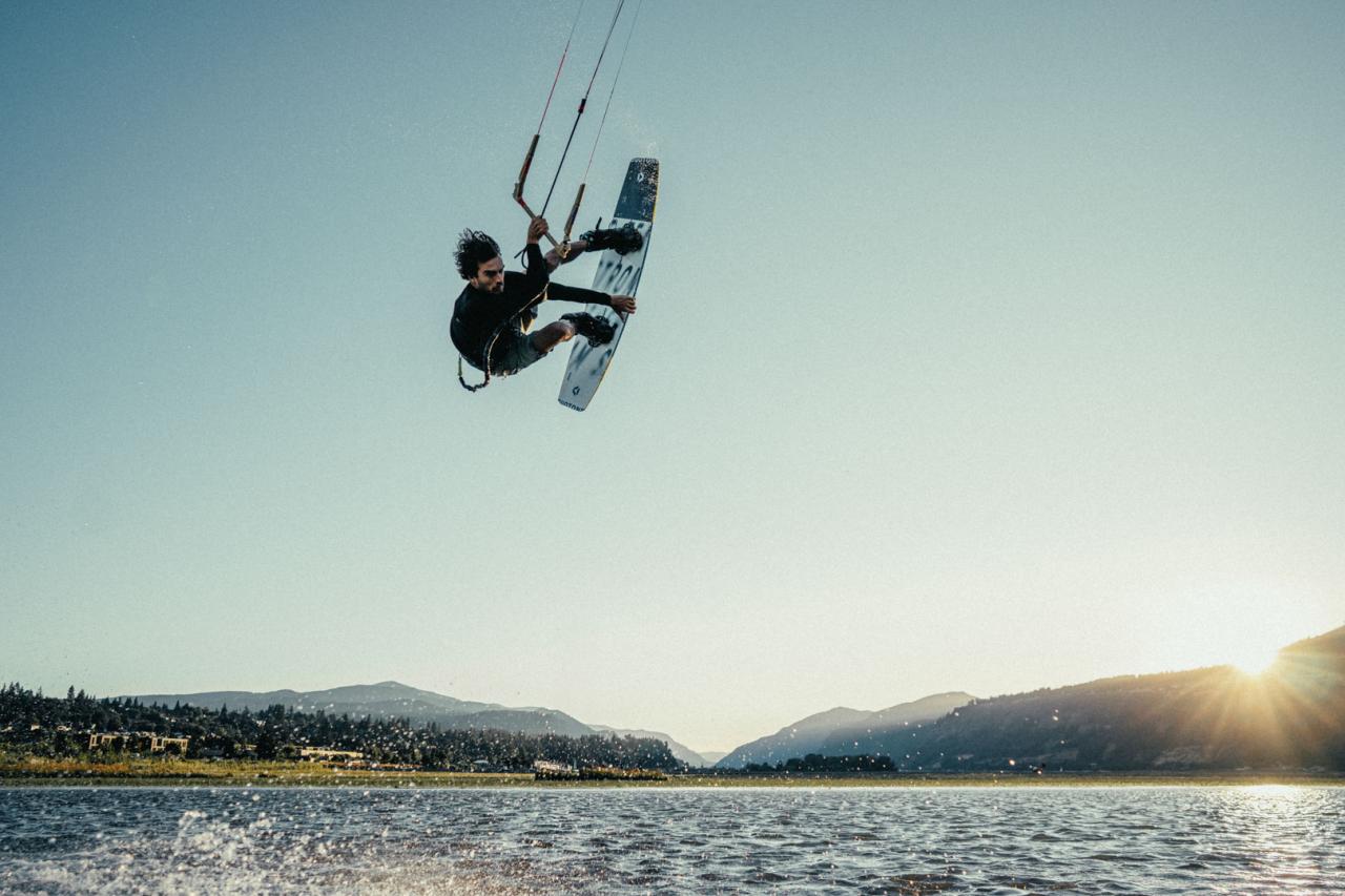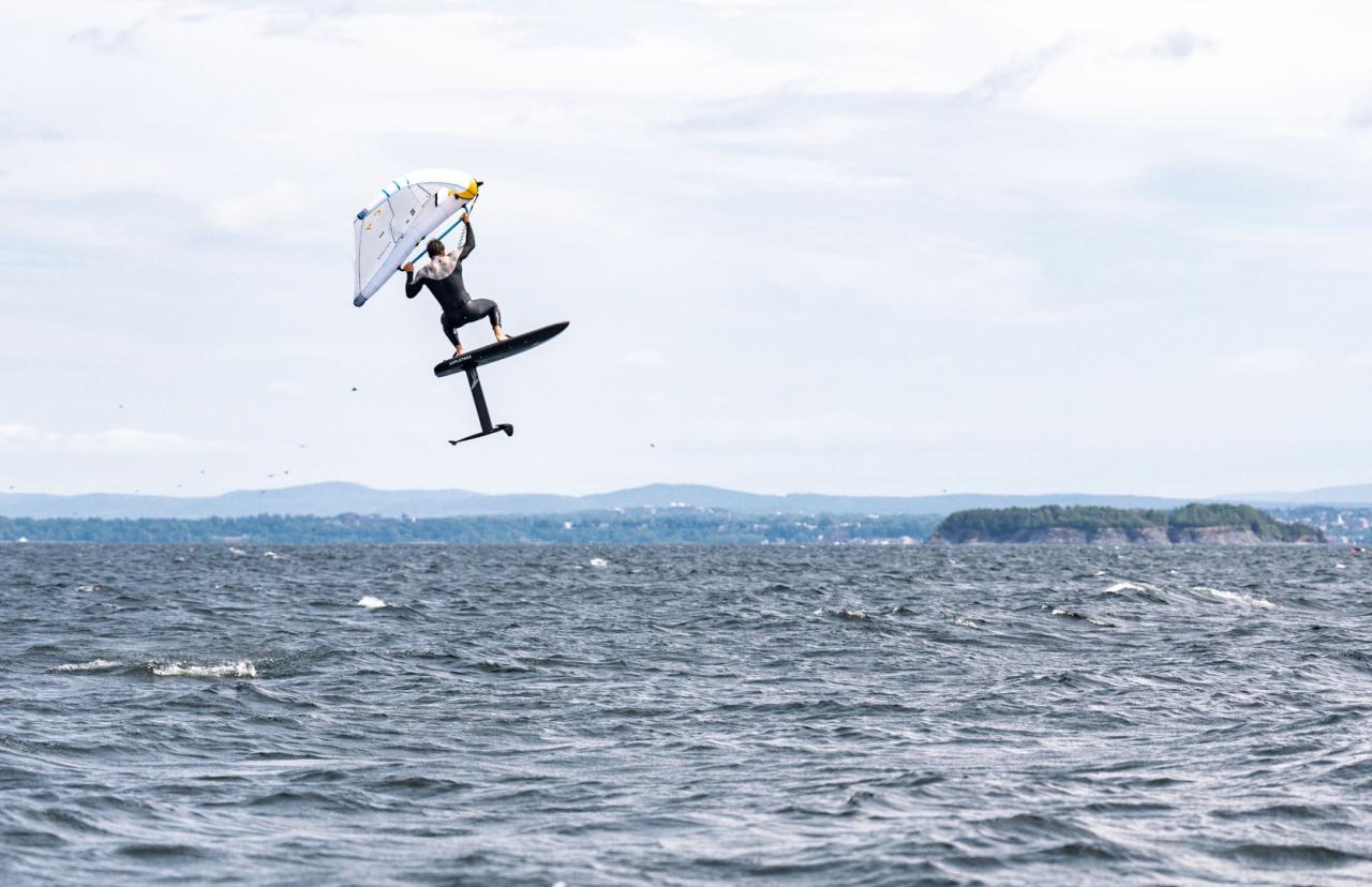 AJ Scully flying high above Lake Champlain on a late season downwind run as he traces a 40-mile line from the cliffs of Thompson's Point to the shores of South Hero Island.Gigi Veve