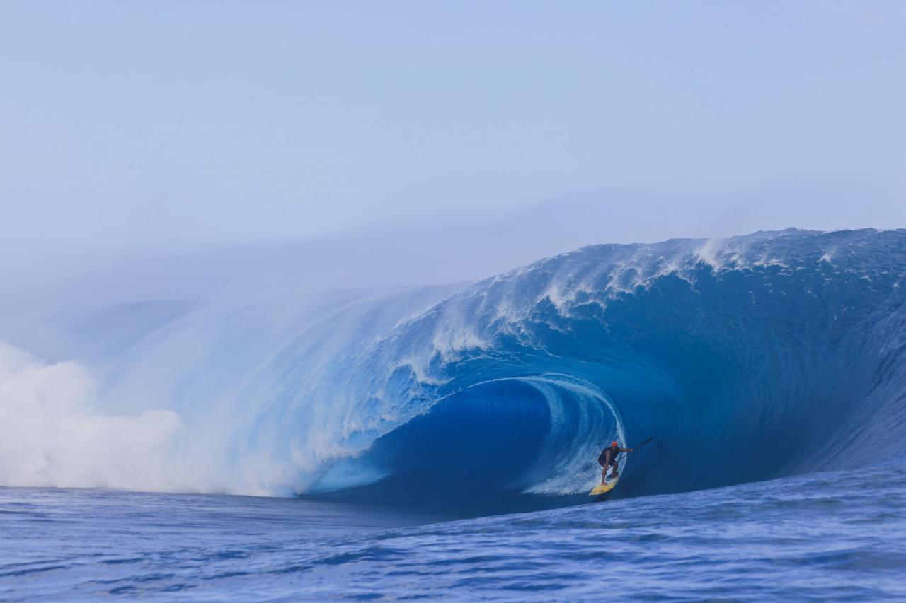 When Teahupoo wakes it offers a rare moment of wonder, beauty and fear. A paddle surfer draws his line through the belly of the beast. Brian Bielmann