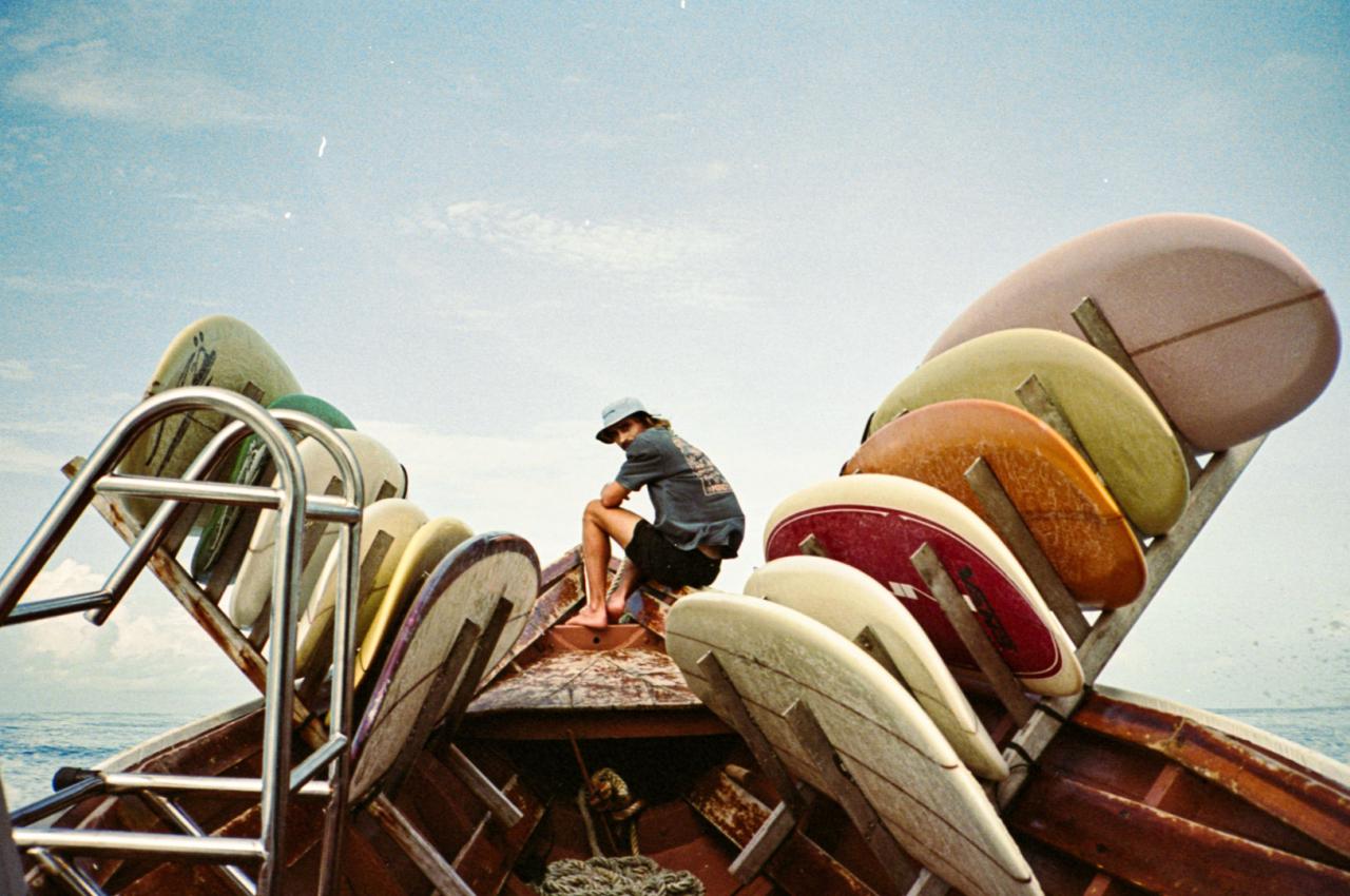 I had surfed Ebay once before, ten years prior on a boat trip, and lucked into the best backhand tube I’d ever ridden. I had dreamed about returning to that fickle wave ever since. It needs a specific direction, tide, period, and wind to even start breaking. As we pulled closer to the actual break, we saw there were no other boats at the lineup, just one leaving. It turned out to be one of Ini’s friends. He gave us a thumbs up and then motioned his arm in the universal tube sign over his head. We were flabbergasted. There wasn’t a single person in the lineup! How could this be? There was a glitch in the matrix for sure. For the next forty-five minutes, Andy, Kassia, and I traded off any and every wave that came through that lineup. As a long-period kind of place, it was set waves or nothing.