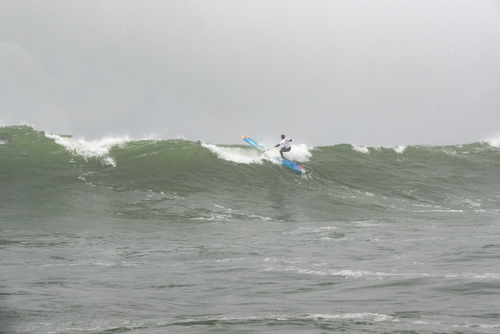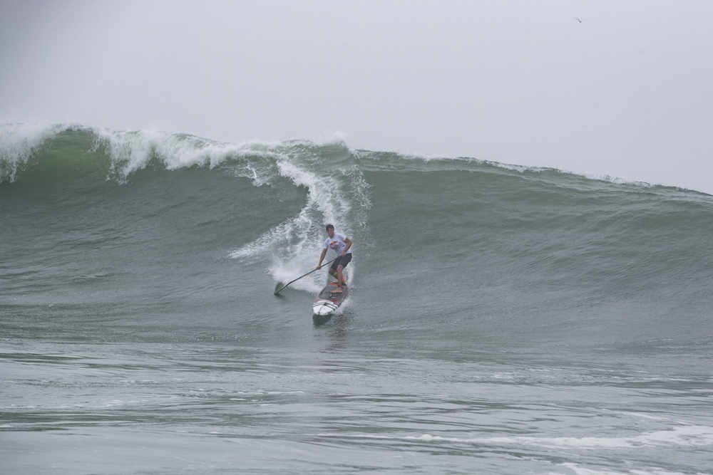The dance continued. As I went out for my last lap, I saw Arthur Arutkin coming back to the beach just behind me. The struggle in the water was immense. I tried to not waste my power and again just wait for that moment when the water flushed back out. I knew I was not the king of the ocean and was at the mercy of some natural powers greater than me. Breathe in, breathe out. Patiently waiting. Hoping. Then it happened again. I darted through the fog towards what I assumed was the horizon. I climbed over that first wave, then had to dive under the second one. I jumped back up and clawed my paddle through the water frantically to barely squeak over a third monster wave. The last wave. Heart racing. I was free.