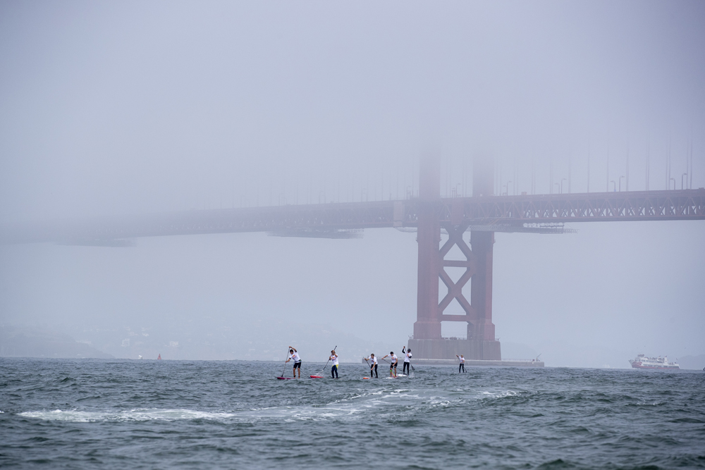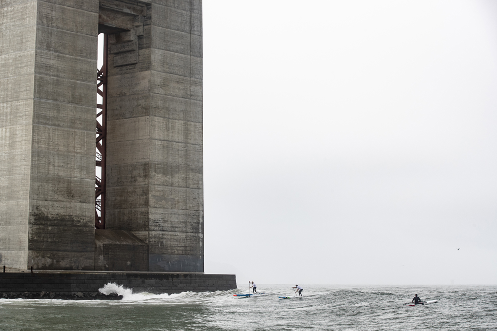 The first point of adversity hit us racers immediately after the first 200 meters when we rounded the corner of the pier and set course for the Golden Gate Bridge. A fresh wind blew into our faces and the intensity of paddling went up a notch.Some guys sighed quietly. It was going to be a loooong grind. As we neared the Gate, which is known for some of the strongest and most treacherous currents in the world, our lead group separated. Connor Baxter and Mo Freites led a break out group that used some wave refractions off the bridge to slide ahead and create a small gap between the rest of us. Their tactic was clear, to create a gap at the beginning of the race that would give them a better chance and more time to clear the waves at the finish line. It was a risk for them, because conserving needed energy was where it would all come down to at the end.