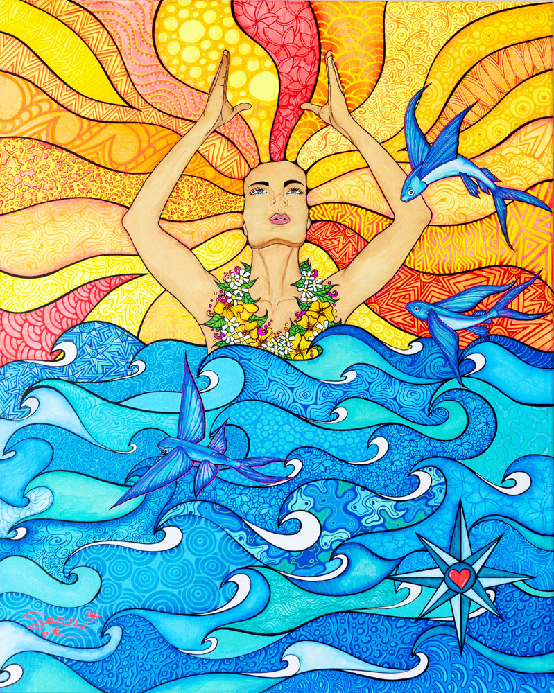 The Kaiwi Channel means so much to me. It was fun to interpret some of the key elements of the Hawaiian Islands into the artwork for this year’s Crossing. The woman at the center of the art represents the goddess creator of the Hawaiian Islands. She is wearing a Lei made of the white Kukui blossom and the yellow Pua‘ilima. These are the official flowers of Moloka’i and O’ahu respectively, bonding the two islands with the Ka’iwi channel. The flying fish are very present in the channel when you cross. They fly out in front of you, over your board and continue to inspire paddlers to keep going, while making it look seamless connecting to water and wind. The compass with the heart in my artwork stands for navigating in the right direction, taking the right line. It also represents the sacrifice each paddler has to make, the endless hours of training, the layers of tears, and the pure heart it takes to paddle from the island of Moloka’i to the island of O’ahu.