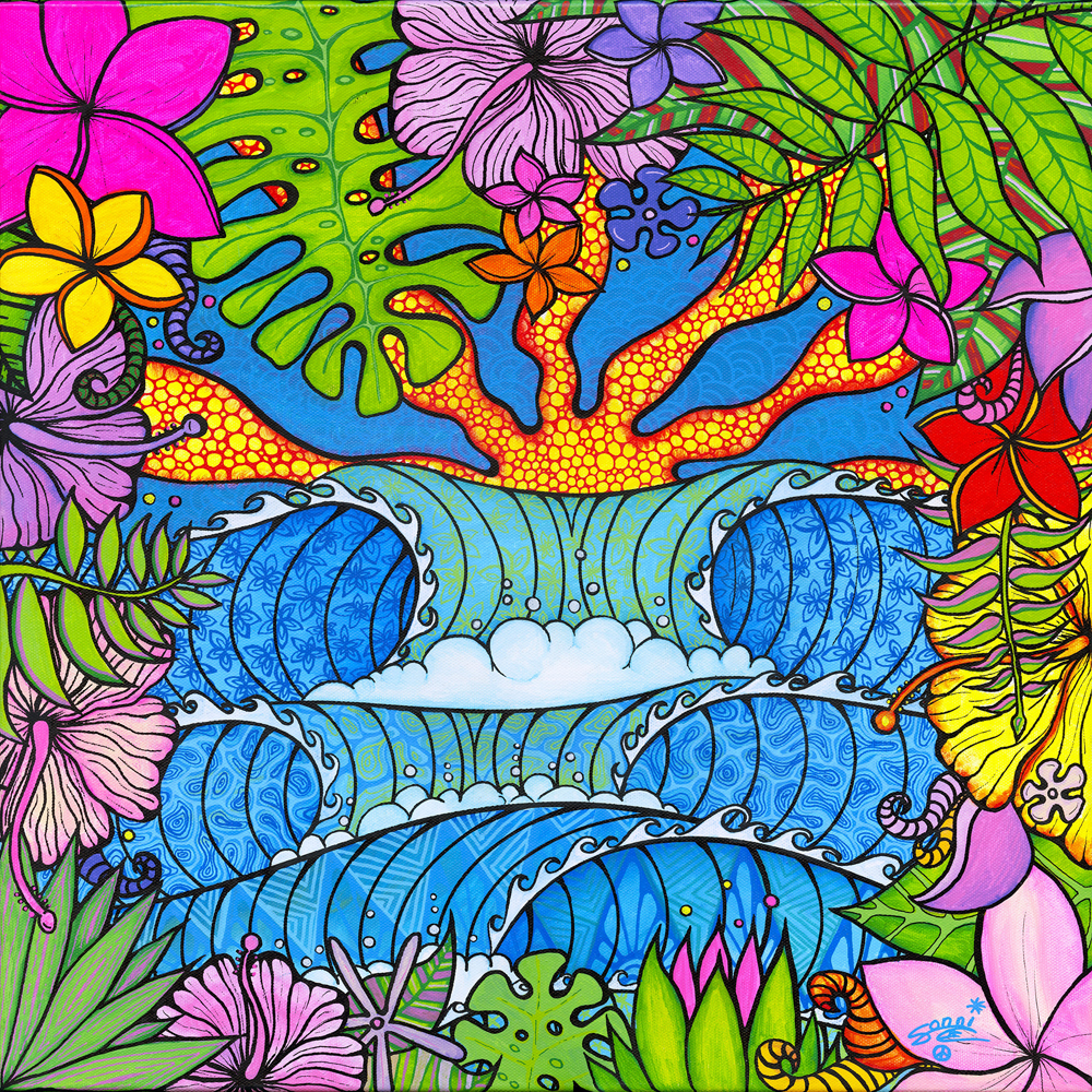 Sonni’s art is a reflection of the colorful places of her travels, the cultures she’s experienced, people she’s met and the waves surfed. All this connectedness of light, color and energy comes through in her work. There are no limits between being under or over water, humans or animals, dark and light. There is no time, no beginning and no end. I understand her colors as an energetic flow - the soul - which only becomes visible to us through the signing of black lines - the embodiment. And so, they melt together in the here and now. It's the MOMENTS from all over the world that stay. It’s the MOMENTS that stay even when we are no longer.”