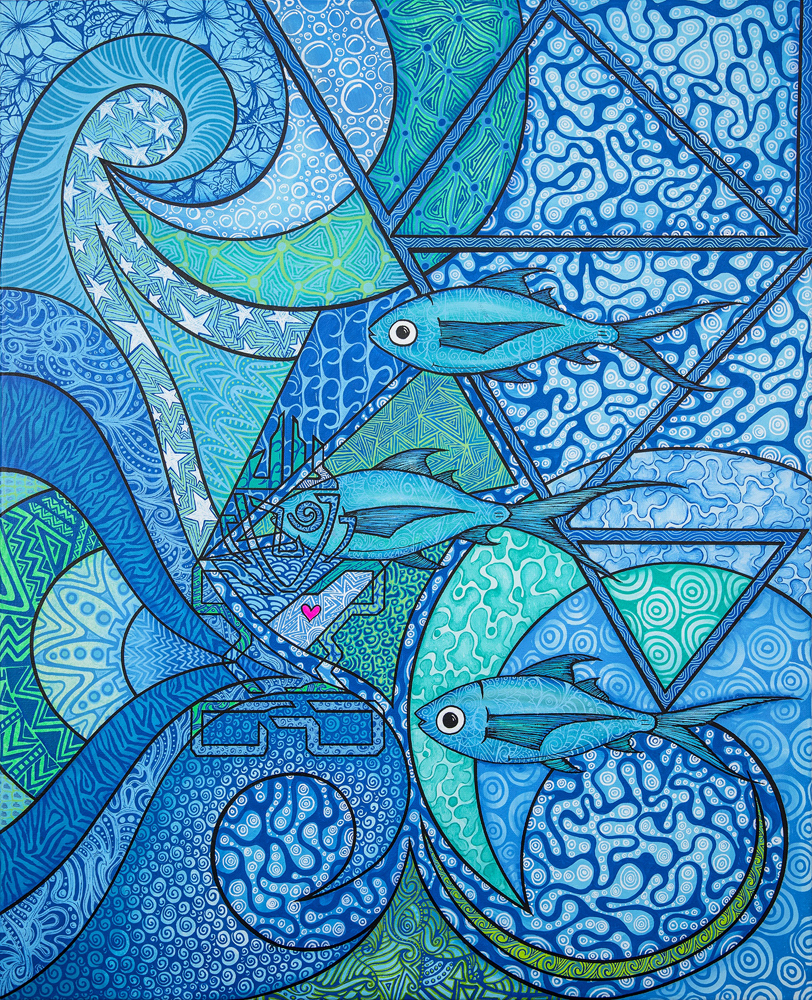 In this painting , you see the fish swimming away from regulated, monotonous, clean, straight lines and edges they have put themselves in over time.These sea creatures are swimming towards flowing, vivid lines, working on getting out of their "comfort zones” and are ready to take risks. The one fish is looking through the eye of the Tiki. He realizes that if you follow your passion and listen to your heart, you are doing the right thing.His message is: “Don ́t let others stop you. Follow your own path. Be different.”