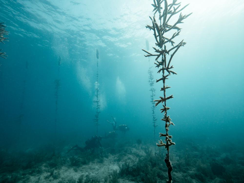 “It’s a similar process,” he explained. “We take a long branch of those corals, like the elkhorn and staghorn varieties, cut it into a bunch of pieces, hang each piece by a piece of monofilament on one of the trees, and it grows like crazy.”