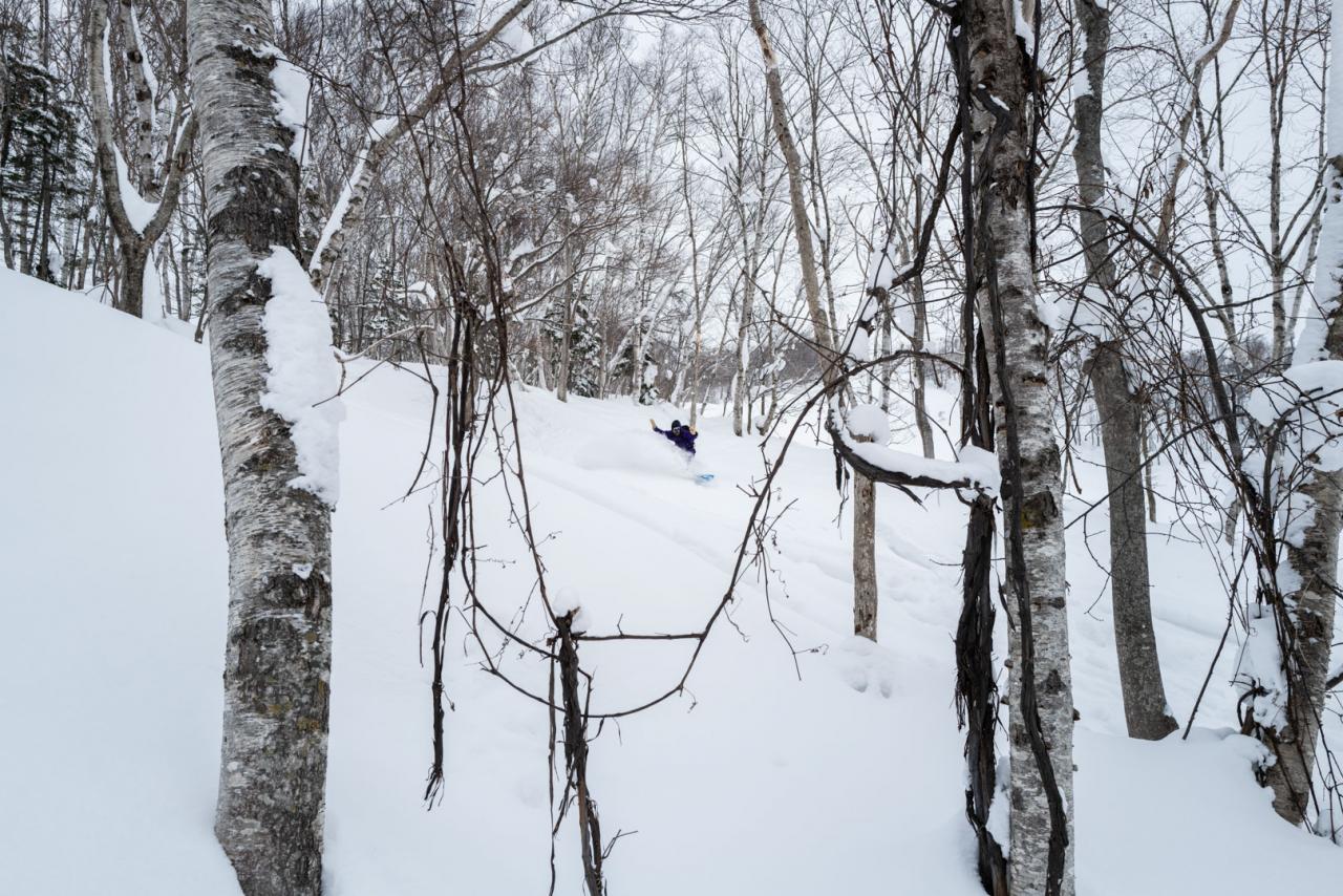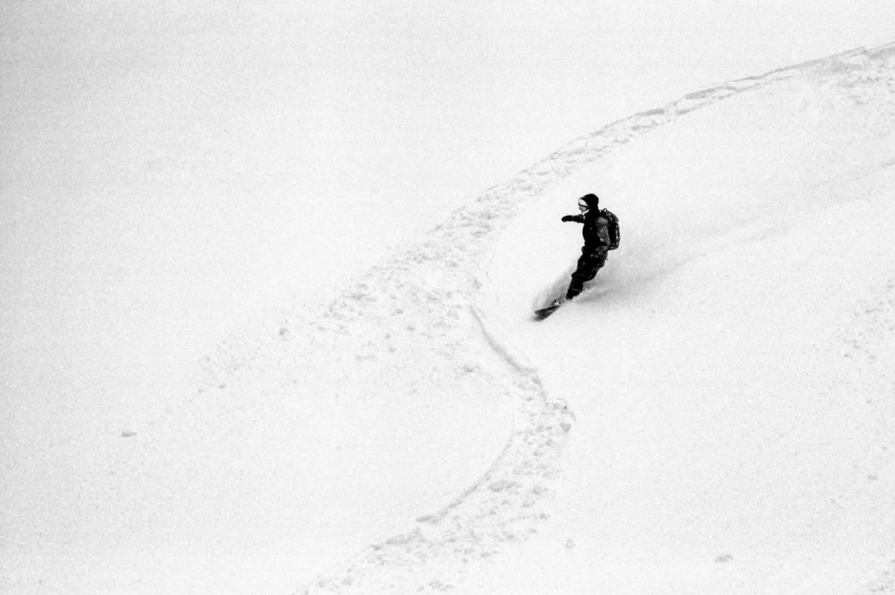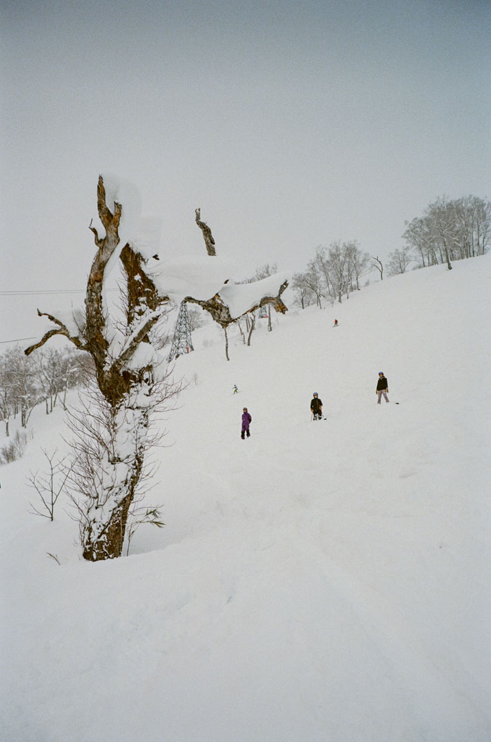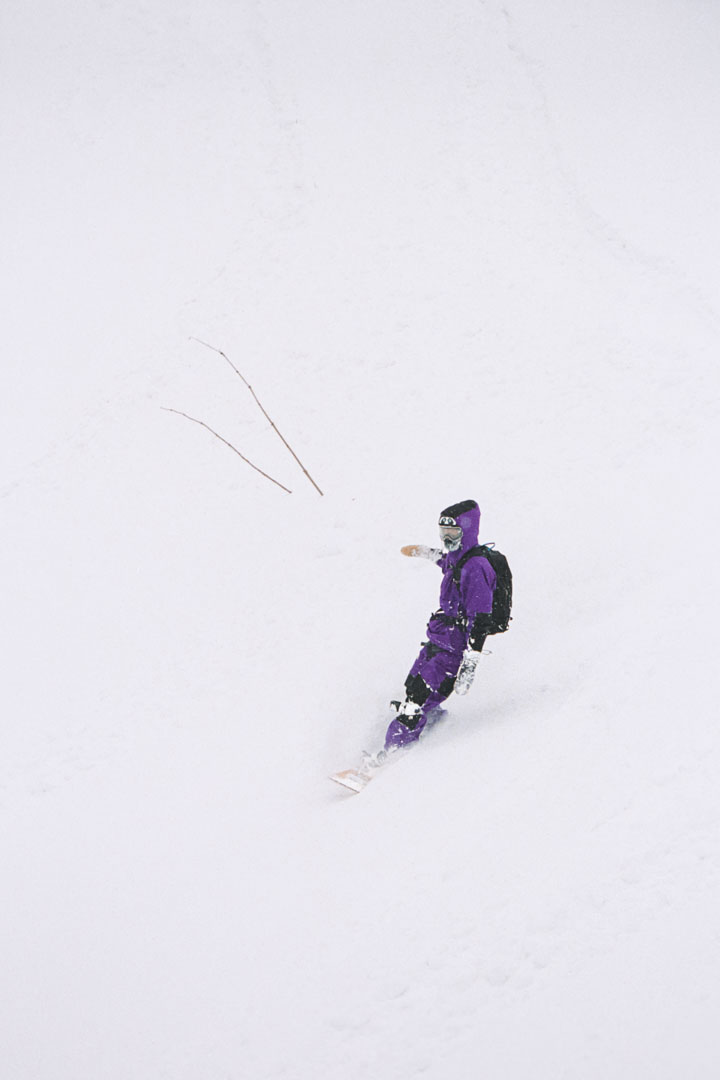 With Mt. Yōtei to my left and an endless sea of well-spaced hardwoods surrounding me, I called my drop and slowly gained momentum. As I picked up speed and the board started to plane on the deep snow, I began to draw my line. I selected a slightly steeper part of the run with a few clumped stands of birches. I made one long toeside turn above one of the trees and trimmed right towards another grouping, doing a shorter speed-reducing (and powder-tossing) heelside turn near one of the striped maples. I took one more heelside turn to scrub a little more speed before entering the final section of the line and eventually the untouched patch of sparkling white powder where we would hopefully take the photograph. After the second speed-adjusting heelside turn, I dropped over a small roller, building my speed back up for the money turn in the little patch of sunlight, twenty feet away from Giles and his Leica. Although I am regular-footed, I did my best Gerry Lopez impression, allowing my board and body to follow my hands and outstretched fingers. All I could hear as I cruised by was the “swooooooosh” of snow being displaced and the sound of Giles’ shutter at just the right moment. I couldn’t help but smile ear to ear as I cruised over the last roller and down into the flats. I jumped off my board “spread eagle” style into a deep cloud of snow.