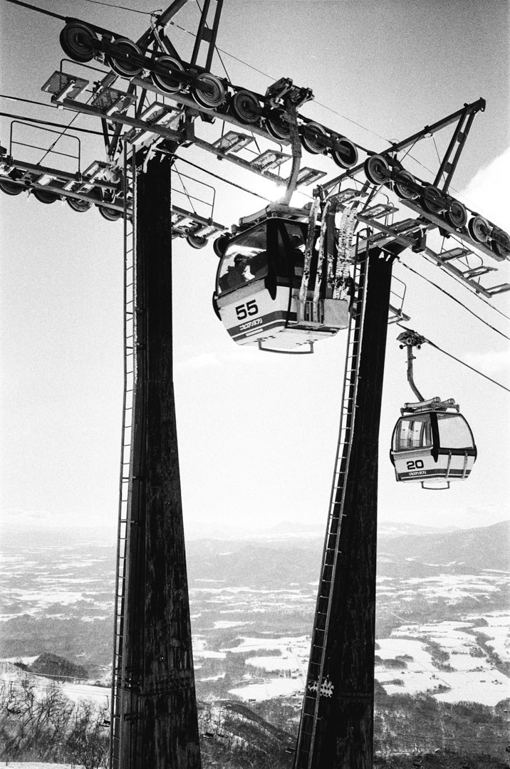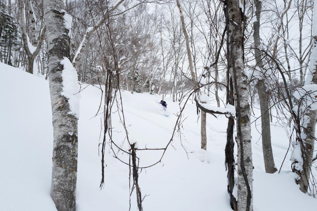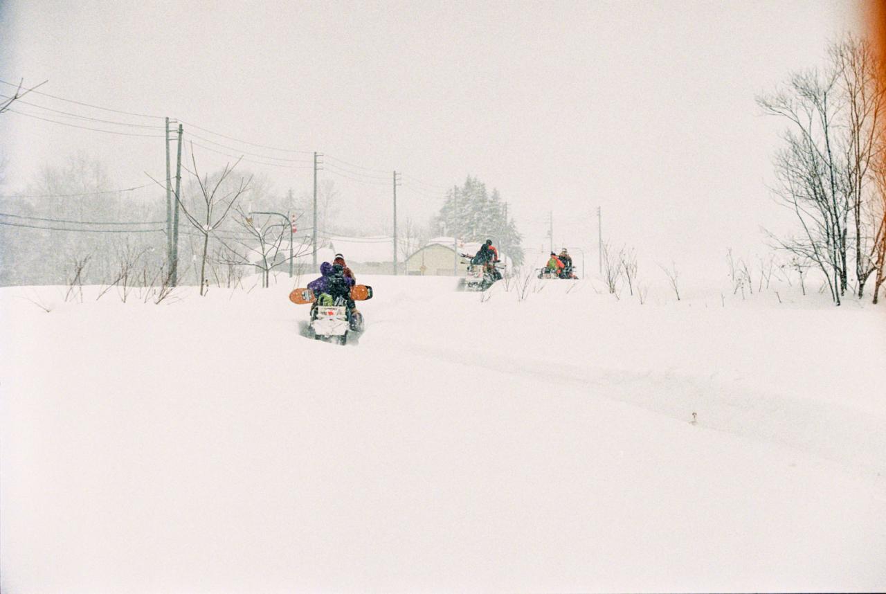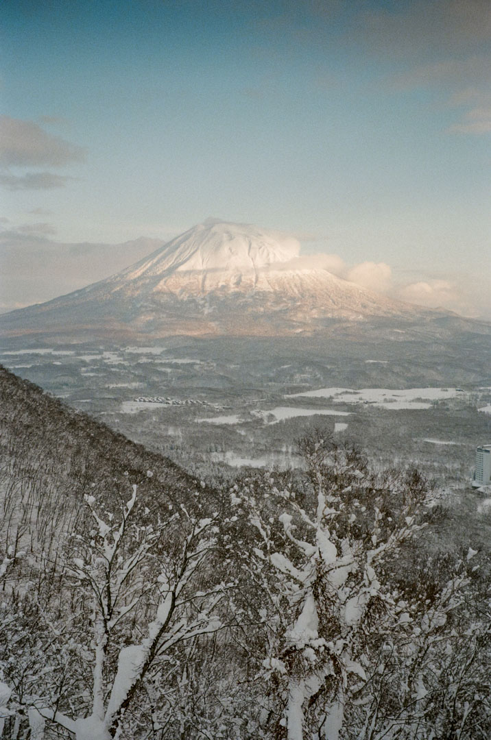 With Mt. Yōtei to my left and an endless sea of well-spaced hardwoods surrounding me, I called my drop and slowly gained momentum. As I picked up speed and the board started to plane on the deep snow, I began to draw my line. I selected a slightly steeper part of the run with a few clumped stands of birches. I made one long toeside turn above one of the trees and trimmed right towards another grouping, doing a shorter speed-reducing (and powder-tossing) heelside turn near one of the striped maples. I took one more heelside turn to scrub a little more speed before entering the final section of the line and eventually the untouched patch of sparkling white powder where we would hopefully take the photograph. After the second speed-adjusting heelside turn, I dropped over a small roller, building my speed back up for the money turn in the little patch of sunlight, twenty feet away from Giles and his Leica. Although I am regular-footed, I did my best Gerry Lopez impression, allowing my board and body to follow my hands and outstretched fingers. All I could hear as I cruised by was the “swooooooosh” of snow being displaced and the sound of Giles’ shutter at just the right moment. I couldn’t help but smile ear to ear as I cruised over the last roller and down into the flats. I jumped off my board “spread eagle” style into a deep cloud of snow.