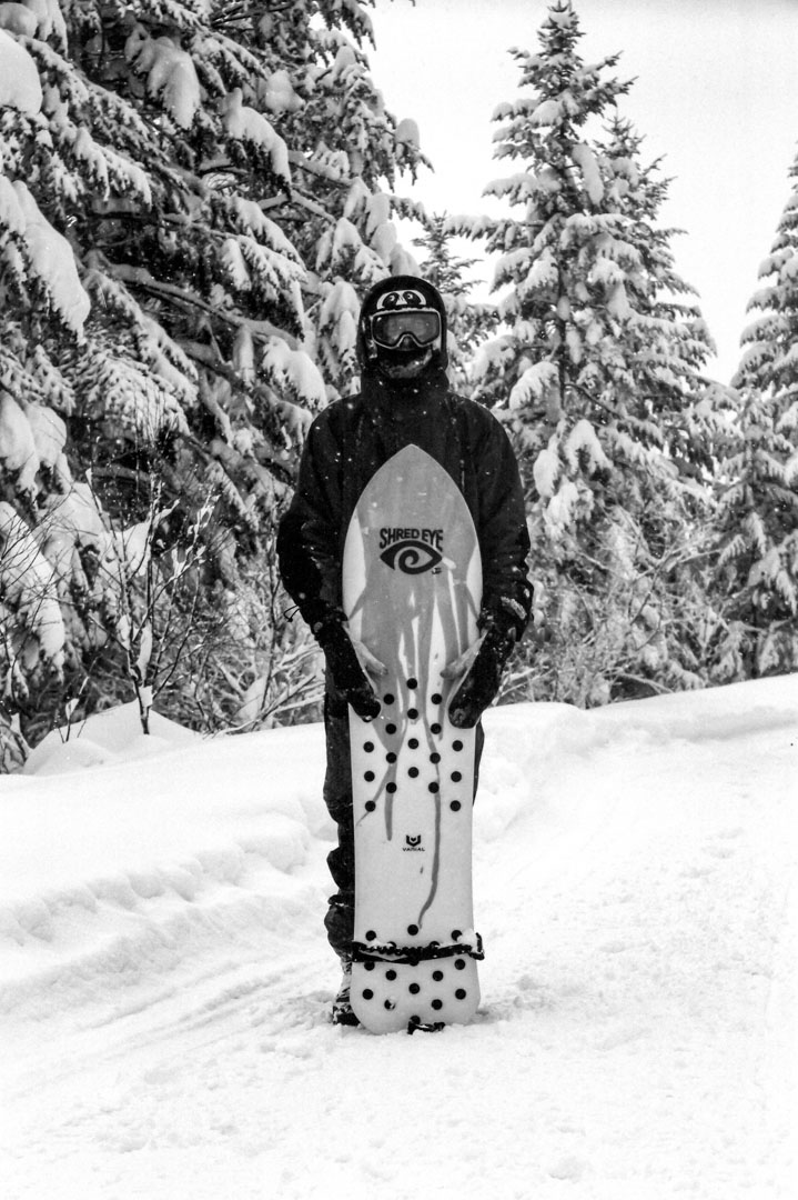 We found a beautiful spot, and as Giles began exploring angles, I took a roundabout approach to avoid disturbing the fresh, untouched snow. I stood at the top of my line, Giles’ trademark red jacket just barely visible through the birches and painted maple trees. If we executed our plan, we’d create art that would capture the memory of this day, further imprinting the adventure into our minds. And the vessel that would bring us to this moment of capture is a work of art in and of itself. Ever since acquiring the board, I knew it belonged here in this country, on this island, in these mountains. As I placed the “Shredeye” powder surfboard under my feet to take that first run, I contemplated its design.