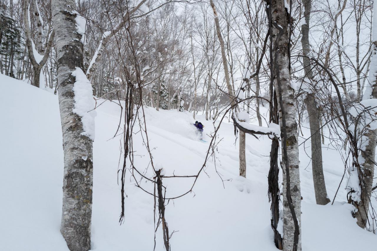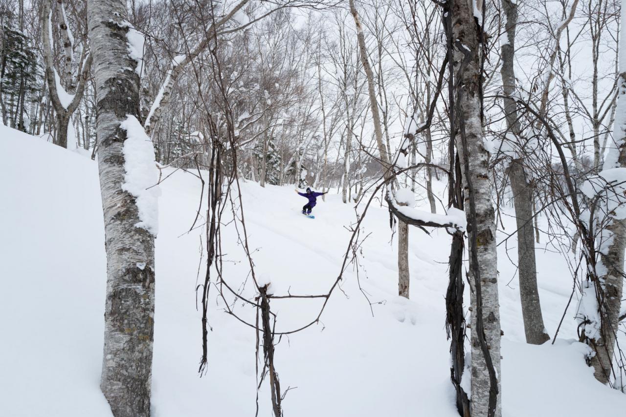 Powder surfing is like a silent dance with snow, where the surfer moves with respect and quiet reverence, allowing the mountain to lead. Just as a whisper blends seamlessly into the winter wind, powder surfing requires the surfer to blend humbly with the natural terrain, leaving only a gentle trace. With these notions in mind, my friend Giles and I started our slow and steady trek uphill, aiming to capture a few moments on film as we soaked in another day of soft powder. We moved quietly, taking in the scenery as we gained elevation. If it were not for the large amount of space between the hardwoods and the trail sign Kanji (the system of Japanese writing derived from Chinese characters), one might mistake the landscape for our home back in New England. It is hard not to feel happy and at peace with the world on this northern island, a feeling many of us get back in our home state of Vermont.