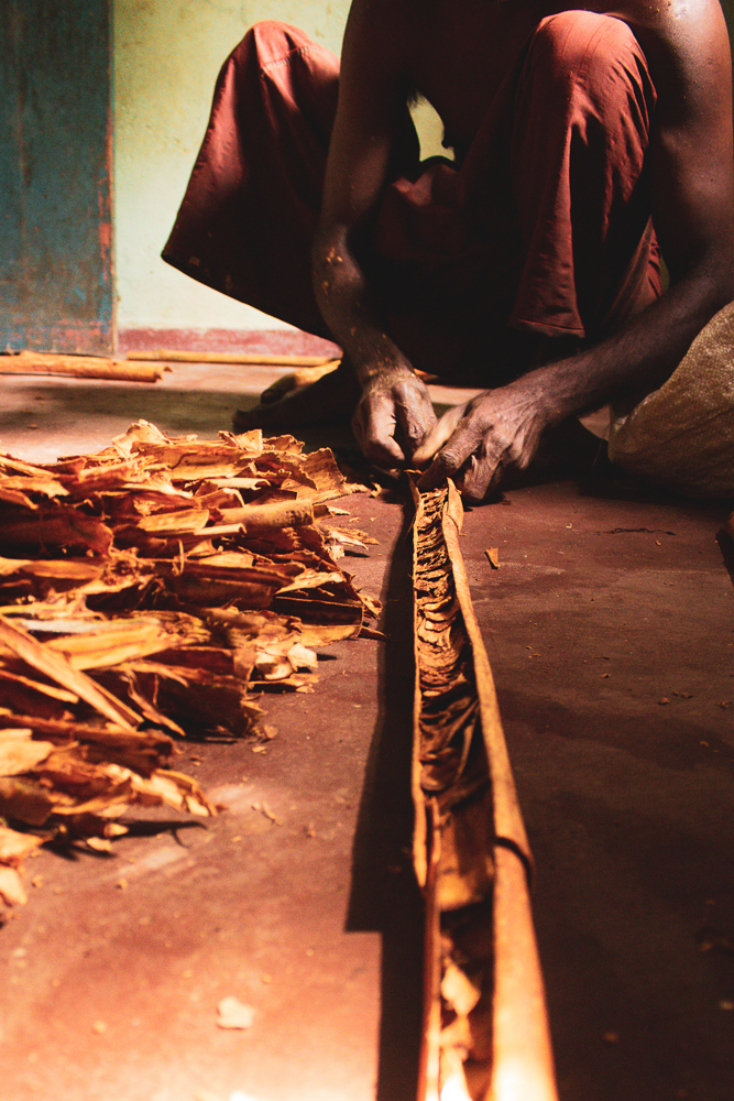 After one morning session, our journey led us so far down a potholed track we almost ran out of gas in the tuktuk. We stopped to contemplate a U-turn beside a distinctively fragrant pile of branches only to look up and see a young man approaching, carrying a machete, smiling ear to ear, head moving side to side. With his free hand pointing back to a driveway he said ‘cinnamon’? Without hesitation we jumped out of our sewing machine with wheels and followed him to the front door of his centuries old family home. Used as the harvesting and processing hub of cinnamon, here three generations have lived a self-sustaining life on a property full of fruit and citrus trees, vegetable plots, and fresh fish caught from a crocodile inhabited lake.