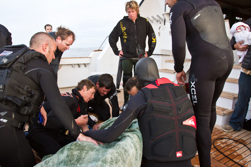 In 2011, in response to Sion’s passing. the Big Wave Risk Assessment Group (BWRAG) was founded by Kohl Christenson and Danilo Cuoto. Under the mentorship of legendary Hawaiian lifeguard and waterman Brian Keulana, the initiative was a significant milestone in the world of water safety and big wave surfing. The aim was to organize comprehensive training initiatives in ocean risk management, and to produce guidelines and strategies to help minimize the potential dangers in all sizes of waves, in order to create safer environments for surfers worldwide. BWRAG Summits quickly evolved into comprehensive trainings in ocean risk management, including case scenario analysis, emergency action planning, mindful breathing, apnea training, CPR and AED training and open-ocean first responder and jet-ski rescue training. They are intense two-day training sessions designed for surfers and ocean goers of all skill levels and recreational backgrounds, teaching one how to be a Surf Responder: an ocean athlete who not only knows how to mitigate their own personal risk, but who can also step in and serve as an asset to others in an emergency situation should they encounter one. Slowly, safety became the top priority of every big wave session, and thoughtfully structured safety systems became the status quo within our core group of friends. We trained diligently in every discipline that Keulana had taught us, and as a result our big wave confidence levels escalated exponentially. Our collective training was put to the ultimate test on December 12, 2012 during that ill fated expedition to the Cortes Bank. Had it not been for the diligent attention put towards cultivating safer surfing practices, I would not be alive to pen this article today.